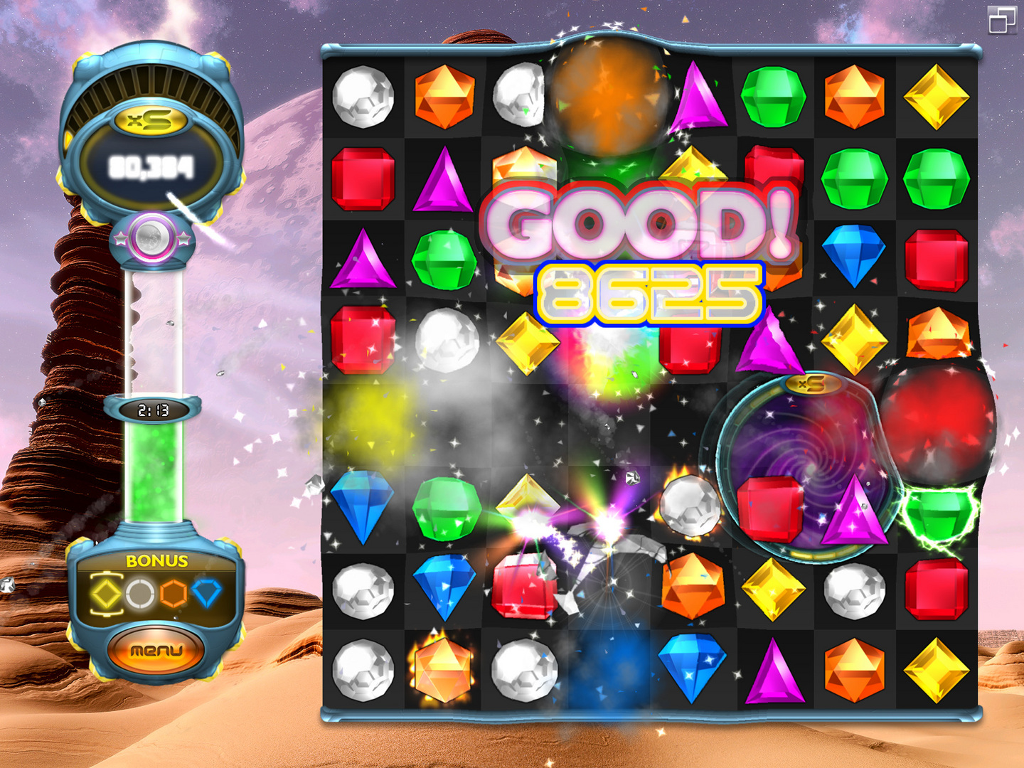 Вращайте, выстраивайте ряды, взрывайте... Ух ты! Это новый блестящий способ играть в Bejeweled! Веселитесь, выстраивая яркие взрывающиеся бриллианты в цепочки, получая массу удовольствия. Свободно вращайте драгоценные камни, собирая крутые комбинации, обойдите неожиданно возникающие препятствия, такие как замки и бомбы, создайте заряженные до предела огненные и световые камни. Когда вам захочется большей сложности или повышения своих навыков, к вашим услугам режим соревнований и пятиминутный блиц-турнир. А если вам просто хочется расслабиться, откиньтесь на спинку кресла и сыграйте в спокойный режим дзен. Неважно, какие правила, вы всегда сможете придумать новую стратегию игры, улучшить свои умения и найти бесконечное число способов победить!