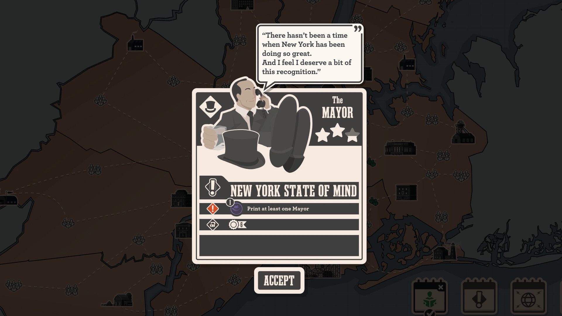 искать неприятную правду?Многие новости можно расследовать по-разному, чтобы раскрыть разные версии событий. Направьте своего репортера по тому или иному пути, но не забывайте о риске: если вы сунетесь в дела мафии, то сможете получить «предложение», от которого будет невозможно отказаться...