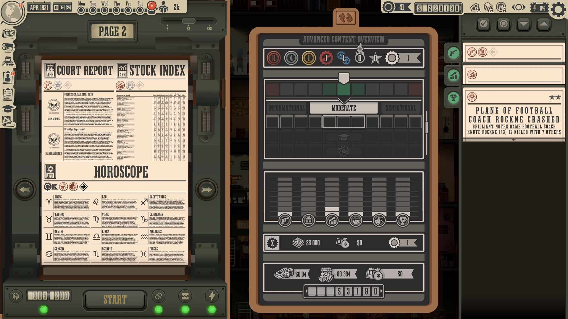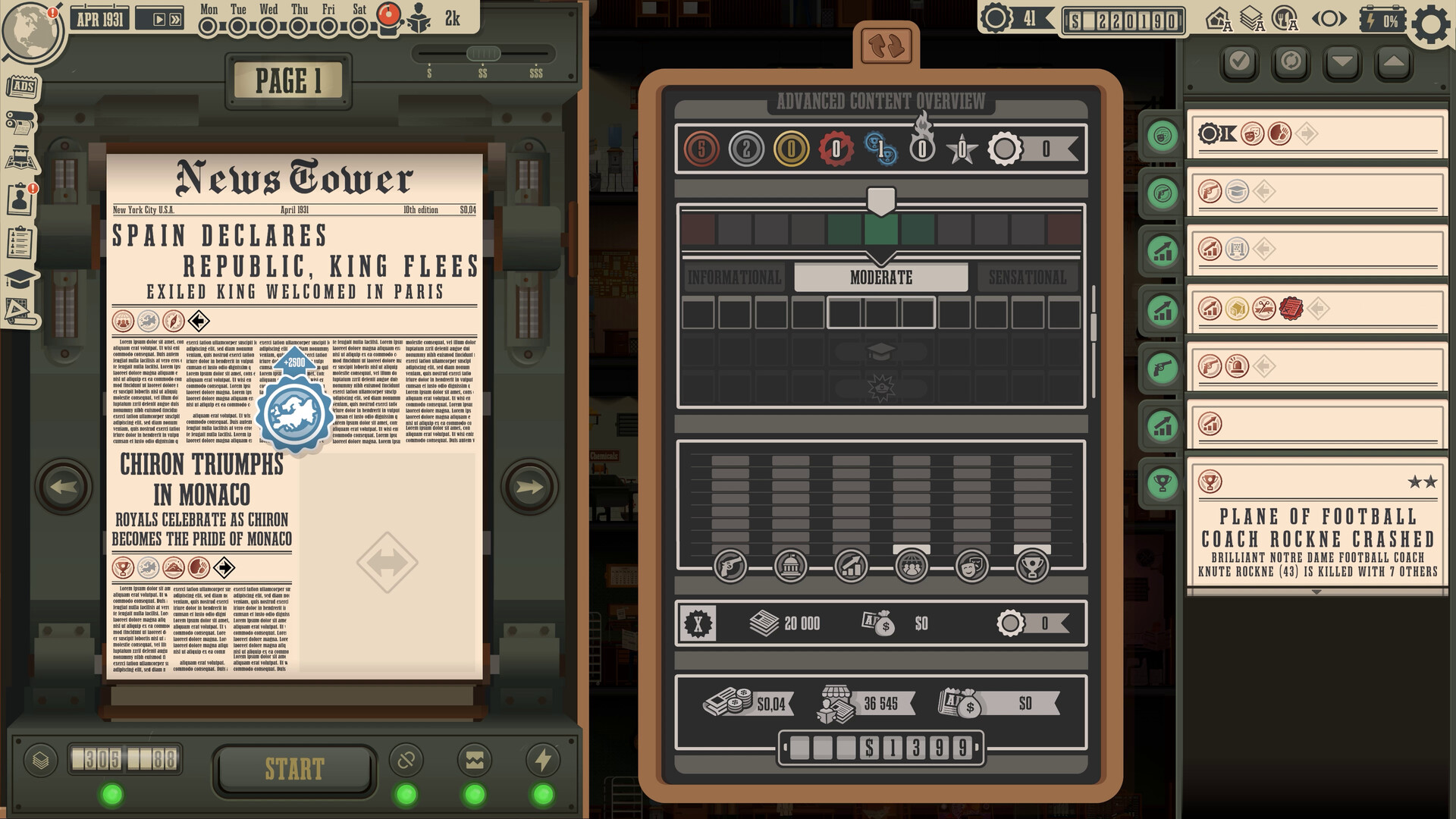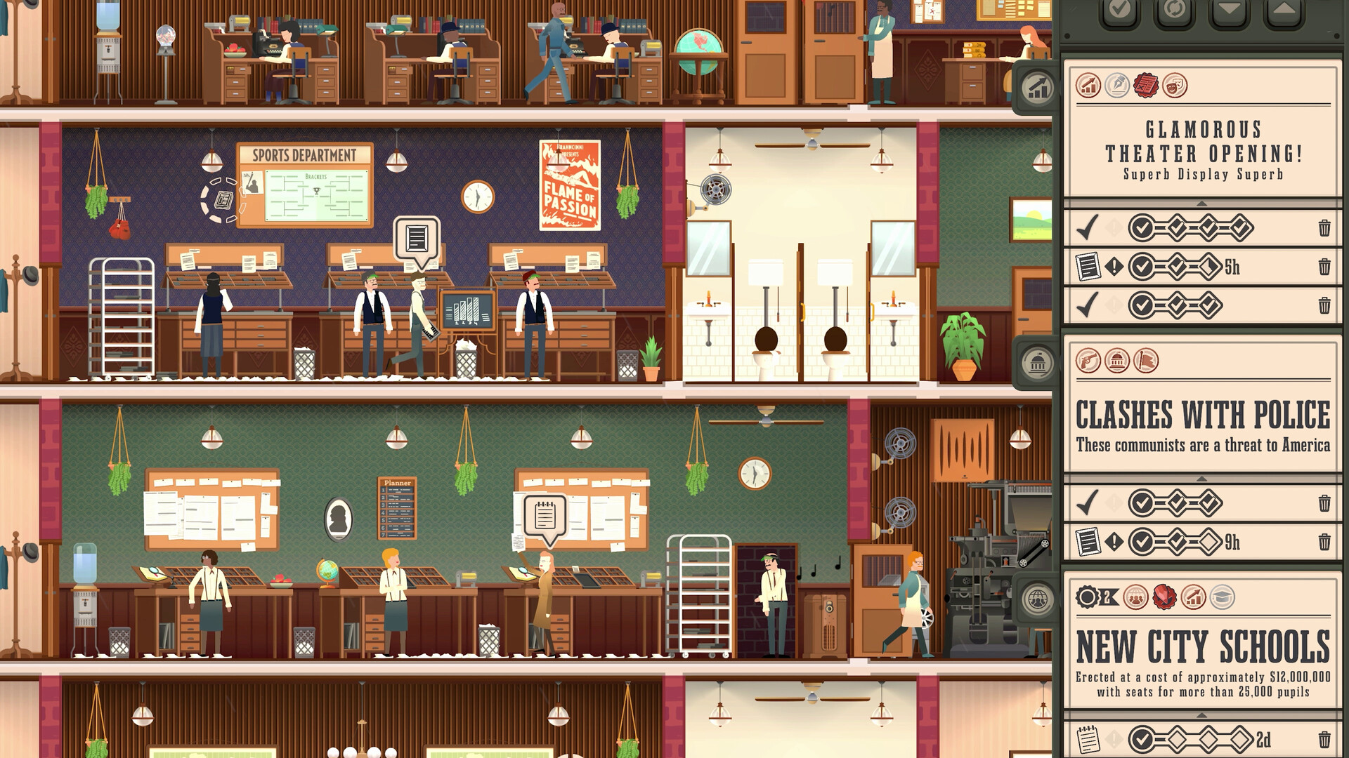 Всё время, что играл не мог оторваться: крайне залипательная и интересная. Два минуса: основная игра короткая, но это сглаживается бесконечным режимом после. Ну и на поздних этапах слишком много микроменеджмента: каждую неделю нужно отсмотреть 10-15-20 новостей, за многими следить (раскидать журналистов и тд) и ещё ручками рекламу ставить. В начале этого как раз достаточно, чтобы не надоело, а вот под конец буквально нет секунды продыха. Но общие впечатления крайне положительные. Очень жду релиз и русский язык.