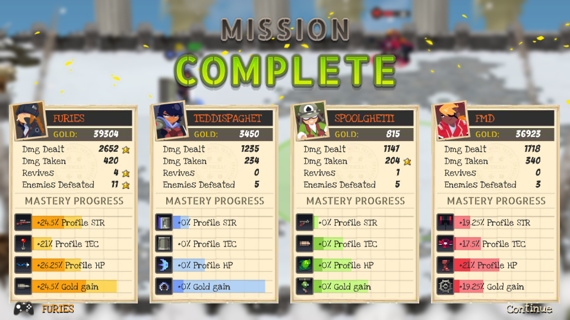 Игра оказалась, на удивление, очень годной, а прохождение в кооперативе удвоило все её положительные моменты. Наша команда по спасению мира состоит из четырёх героинь, отличающихся не только внешностью и характером, но и геймплеем. Причём различия кардинальные: если одна будет постоянно врываться в самое пекло, раскидывая врагов по всему экрану, то другая предпочитает держать дистанцию и метко отстреливать их. Также мы имеем для каждого из персонажей своё дерево улучшений и уникальный набор снаряжения. Улучшения позволяют повысить силу, живучесть и другие особенности героинь, а смена снаряжения может заметно преобразить геймплей, изменяя принцип действия навыков, коих здесь по 4 для каждого персонажа. Но, честно говоря, половина открываемого снаряжения кажется довольно бесполезным. В некоторых местах ощущается высокая сложность, особенно при прохождении новой игры+, но это даже здорово, так как игра бросает какой никакой вызов. Их прохождение совместно с другом приносит особенное удовольствие, потому как грамотно комбинируя ваши способности, можно выносить врагов максимально быстро и эффективно. Ещё тут много забавных моментов по ходу сюжета. Да, мир на грани уничтожения, но похихикать над злодейским злодеем - это святое.