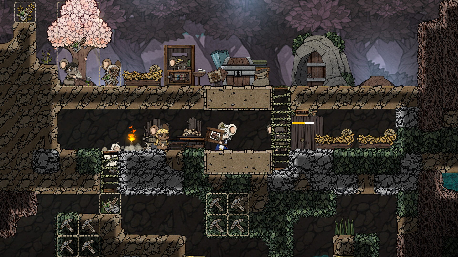Во многом отличный симулятор колонии, красивый и забавный арт, приятная расслабляющая музыка и тупящая логика мышей, которая резко прерывает умиротворение! На начальных этапах, пока колония небольшая это не сильно заметно, но когда рабочих становится много это сильно начинает доставать. Они уж больно часто любят себя закапывать, отрезать пути, кучей бегать на стройку одного элемента с ресурсами и каждого в лапках, а потом кучей несут ресурсы назад, потому что самый быстрый уже начал работу. И такое частенько. Стройка на больших расстояниях всегда затягивается, ведь они кучей бегут делать один кусочек провода и так по кругу. А ещё снос платформ, лестниц и подобного, это 100% что пару штук застрянут на кусках до которых не добраться и будут стоять страдать. Ладно если повезло и застрял один, можно воспользоватся призывом, классная штука! Где бы мыша не находилась, моментально прилетает к королеве. Это очень сильно помогает. Но есть кд, если застряло много, легче возвести лестницу. Так что сносом лучше уж заниматься самостоятельно. Казалось бы в игре есть дроны, которые могли бы решить проблему со строительством, но и они безбожно тупят. Могут несколько минут стоять и нечего не делать а потом просыпаются, а могут просто пропасть и всё, постройка пустая и нечего не делает. Приходится перезапускать дрон станцию в ручную. Вот так и бегаешь от одной станции к другой. Ну это ладно, всё это мелочи. Игра всё же получилась хорошей.
