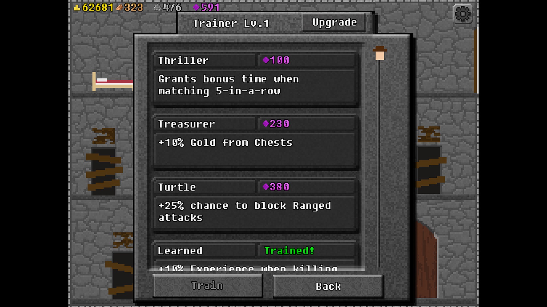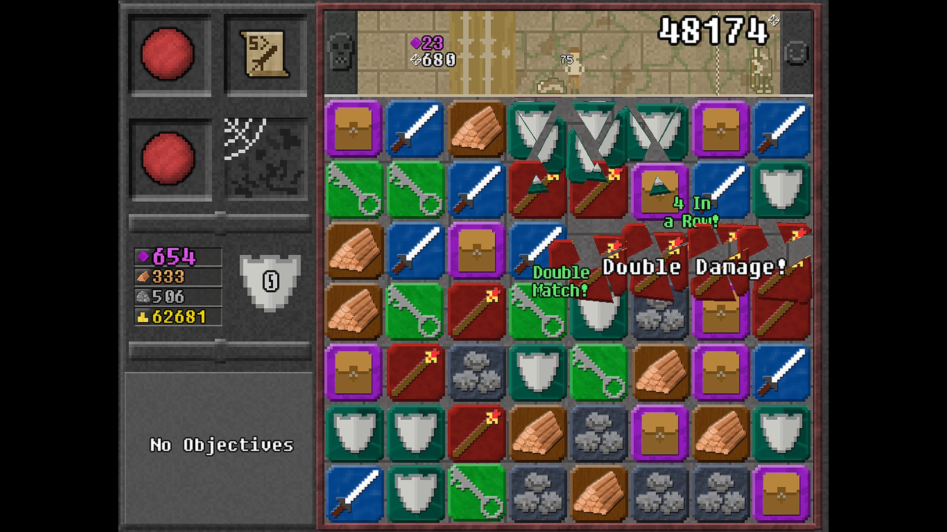 [h1]Очень затягивающая смесь «3 в ряд» и ролевой игры.[/h1] Наша цель – набрать 10млн. очков за один заход и достижение её будет долгим, но интересным. Механика игры простая – перемещая столбик или строку совмещаем одинаковые плитки чтобы получилось три или больше. В зависимости от того, что мы совместили, получим соответственное действие – атака, защита, сбор ресурсов или опыта и т.д. Нам нужно продвинуться как можно дальше, убивая врагов, открывая двери и сундуки. Враги, кстати, отличаются друг от друга сопротивлением к атакам. Некоторые не восприимчивы к магии и их надо бить мечем, а на других вообще не действует оружие и приходиться стараться совмещать плитки с магией. Между забегами мы занимаемся прокачкой. В построенных на собранные ресурсы комнатах, мы можем улучшить экипировку или выучить новые умения. https://steamcommunity.com/sharedfiles/filedetails/?id=3431406385 Графика в игре пиксельная и очень схематическая, но она не напрягает, потому что основную часть экрана занимает игровое поле, а в самом верху происходит какое-то действие за которым следить особенно некогда. Музыка в игре быстро надоедает – там всего две мелодии. Игру рекомендую, она обладает притягательностью, когда делаешь последний заход, а потом ещё и ещё один, ну точно последний. Оторваться бывает сложно.