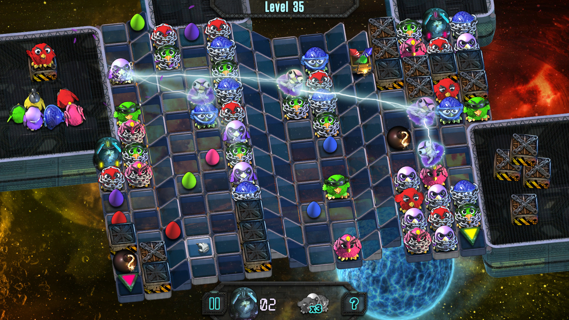 Для того, чтобы выполнить задание, вам необходимо расчищать себе дорогу, составляя цепочки и убирая с игрового поля птиц одного цвета, причем, если на них надеты цепи, вам потребуется приложить два раза больше усилий. Если за один ход создать цепочку не получилось, на поле в случайных местах появляются новые птицы, которые могут нарушить все ваши планы! С каждым неэффективным ходом их становится все больше, поэтому просчитывайте ваши действия, на несколько шагов вперед, если планируете добраться до финала этой истории, и не забывайте пользоваться бонусами!