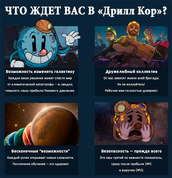 В «Дрилл Кор» мы не просто добываем полезные ископаемые — мы защищаем будущее! Нам нужны стратегически мыслящие и находчивые лидеры, которые будут управлять нашими передовыми проектами. Сможете проявить себя в гонке