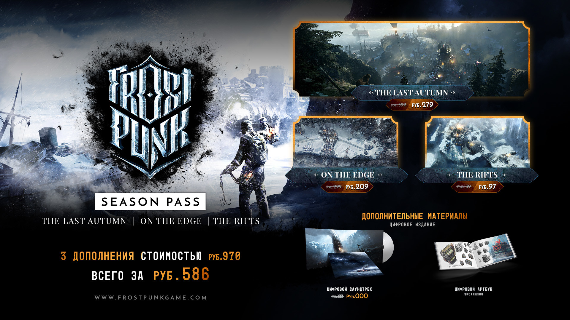 сезонный абонемент для Frostpunk полностью доступен и завершен! Он откроет вам доступ ко всему дополнительному контенту, который игра получила после релиза, в том числе к трем расширениям (