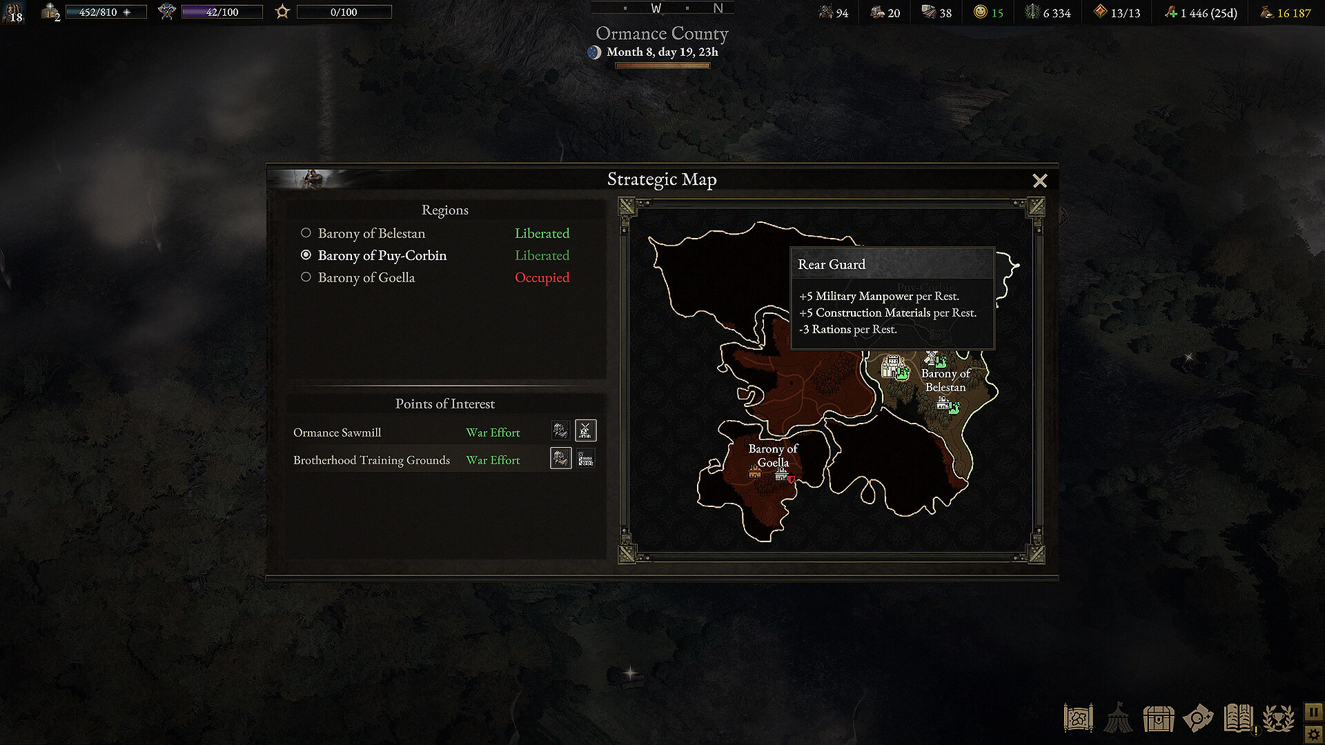 Чтобы выдворить скельмиров из Орманса, вам потребуется военная мощь. Жители освобожденных территорий могут пополнять войска. Каждое землевладение либо производит полезные ресурсы, либо дает особые преимущества, например больше провизии с ферм или огневую поддержку со сторожевых башен. Выбирайте их с умом, чтобы организовать эффективное сопротивление. Каждая освобожденная область повышает военную мощь, а каждое верное решение приближает вас к освобождению Орманса.