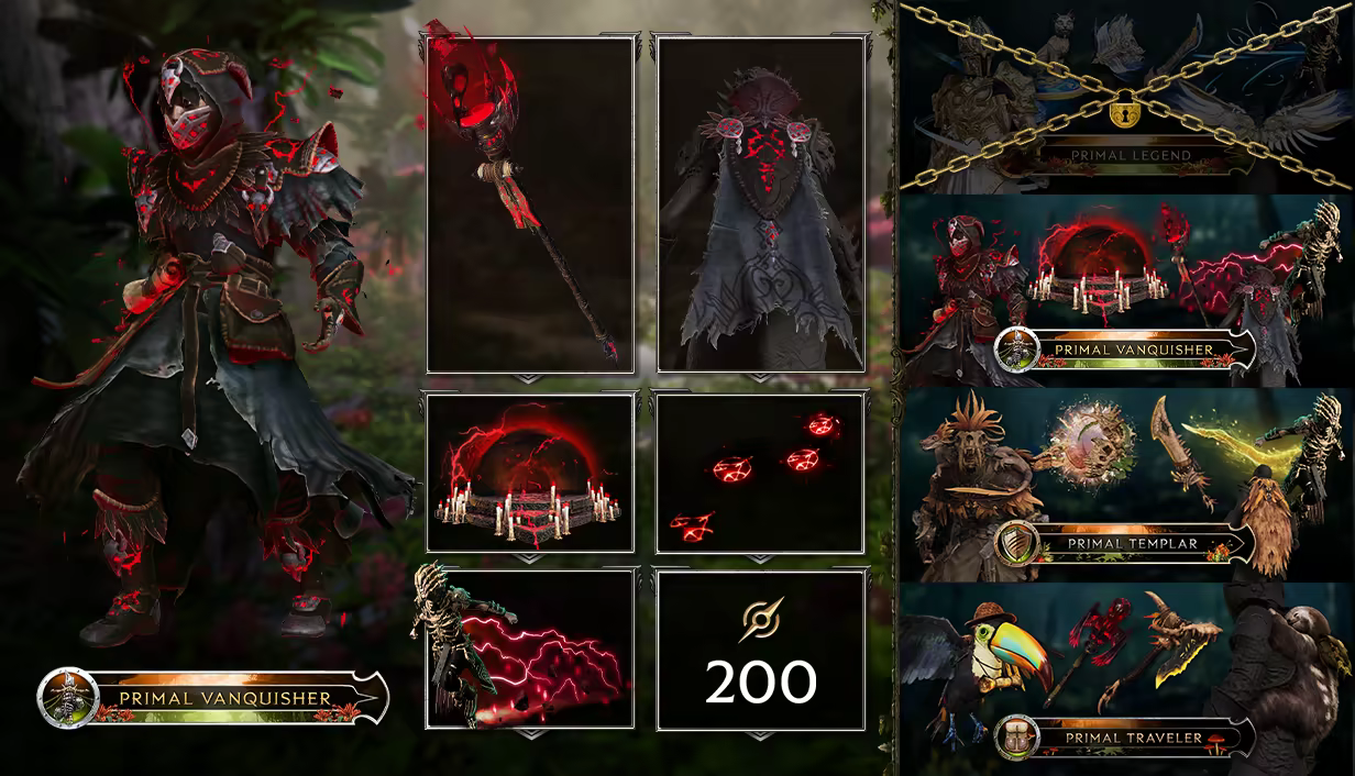 Набор «Первобытный покоритель» дарует вам силу, черпаемую не только из зверей и земли — но и из темных обрядов, о которых шептали те, кто бродил в одиночестве сквозь дикие земли. Облаченный в перья, кости и украшенную рунами сталь, вы ступаете тропой охотника, провидца и призванного духом.