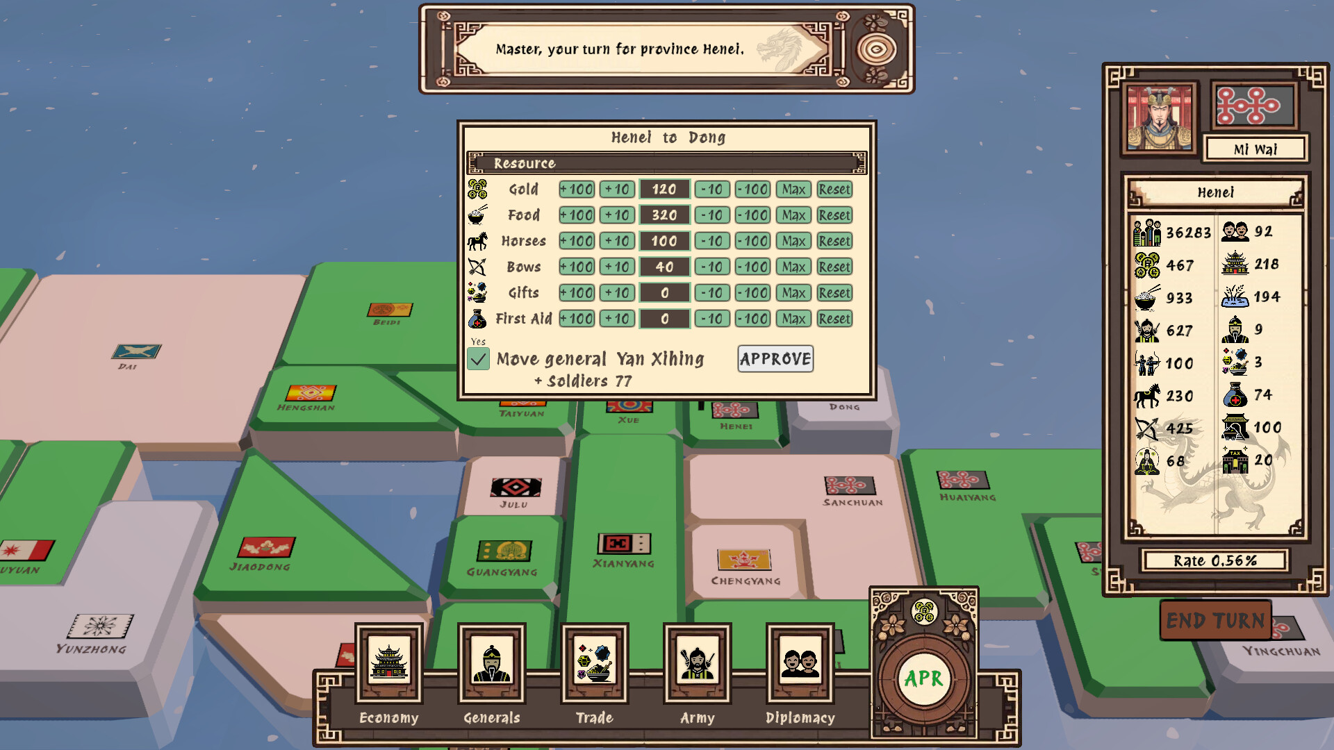 Глубокое Управление Провинциями — Контролируй ресурсы: солдаты, урожай, еда, лошади, луки и оружие. Обучай войска, награждай генералов, ищи скрытые таланты и усиливай военную машину с помощью добычи, торговли и хитроумного странствующего торговца.