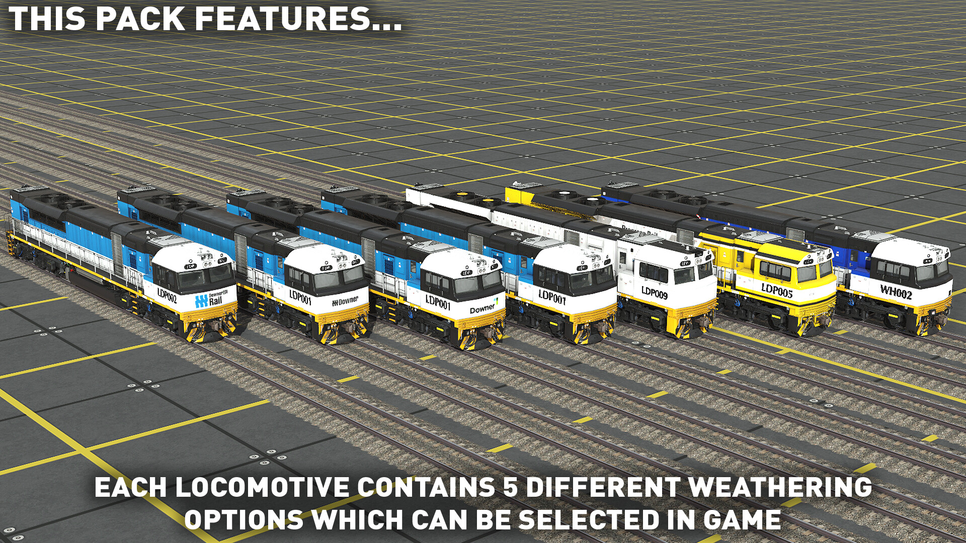 Designed specifically for Australian Conditions, the GT46ACE is fitted with a turbocharged EMD 16-710 engine, and AC traction, and is one of the most powerful classes of locomotive in Australia. This pack features the LDP class locos in Downer EDI, Progress Rail, and Whitehaven liveries.