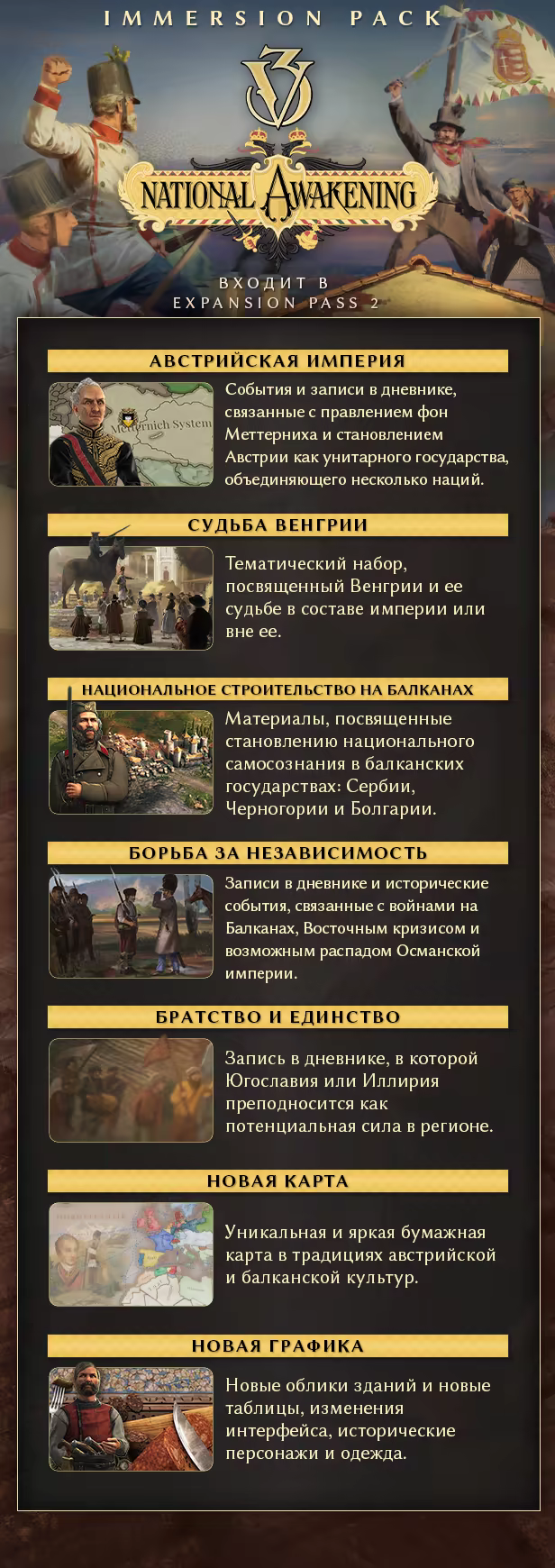 Сто лет национально-освободительной борьбы в Центральной Европе и на Балканах выходят на первый план в дополнении National Awakening для Victoria 3. Османская империя постепенно теряет контроль над владениями в Европе. Австрию, исторического соперника турок, раздирают внутренние противоречия, борьба идеологий и национально-освободительные движения. Это дополнение позволит вам погрузиться в самое сердце драматических событий, происходящих в «Пороховой бочке Европы».
