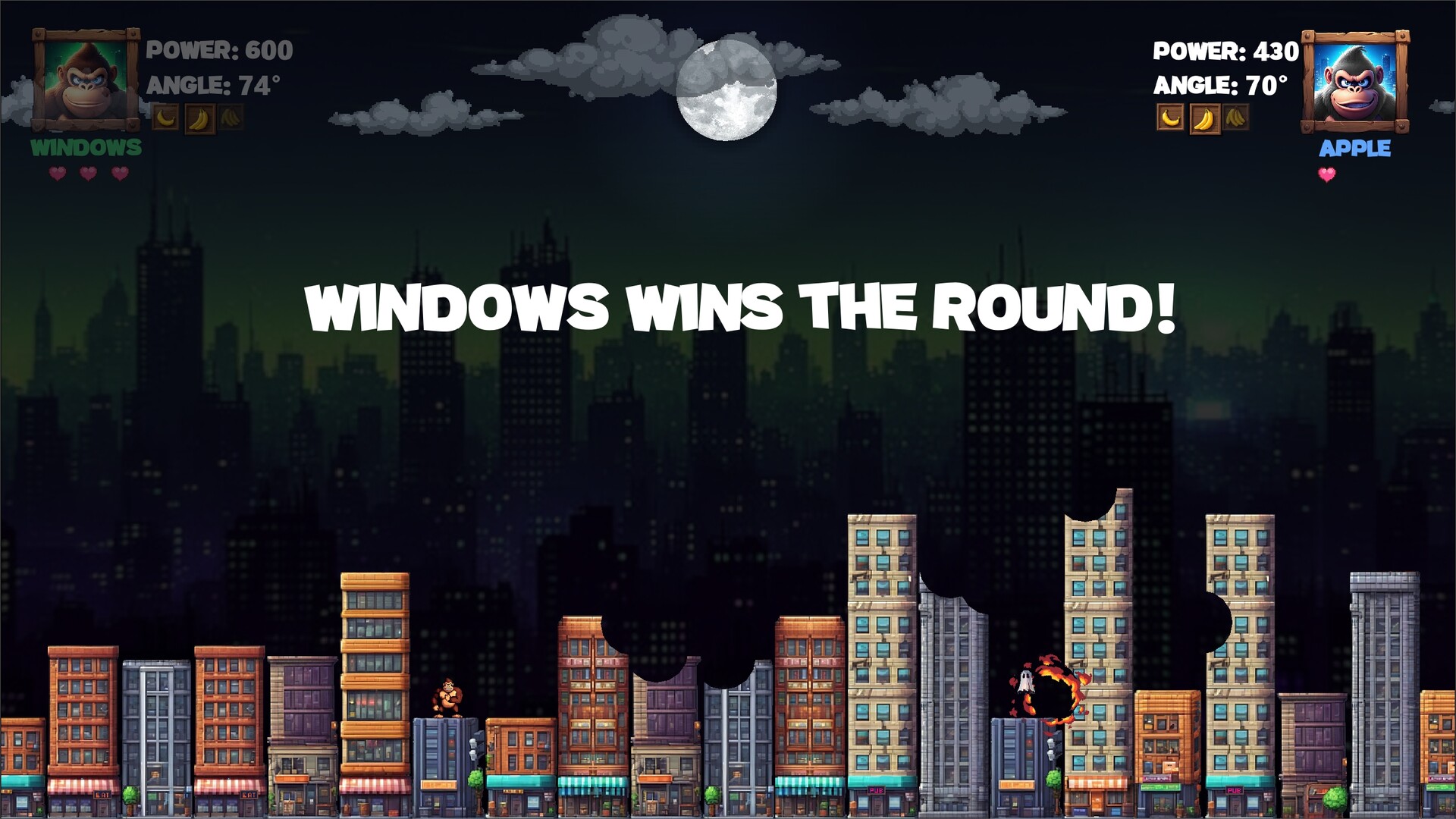 Выбери своего гиганта — могучего Гориллу или грозного Йети — и вступи в бой на вершинах небоскрёбов. Цель проста: пережить соперника и остаться последним стоящим! Освой классическую механику угла и скорости, чтобы метать бананы через весь город. Каждый бросок выбивает куски из зданий и динамически меняет поле битвы. Учитывай меняющийся ветер в каждом раунде, чтобы нанести идеальный победный удар. Первый, кто выиграет 3 раунда, становится чемпионом!