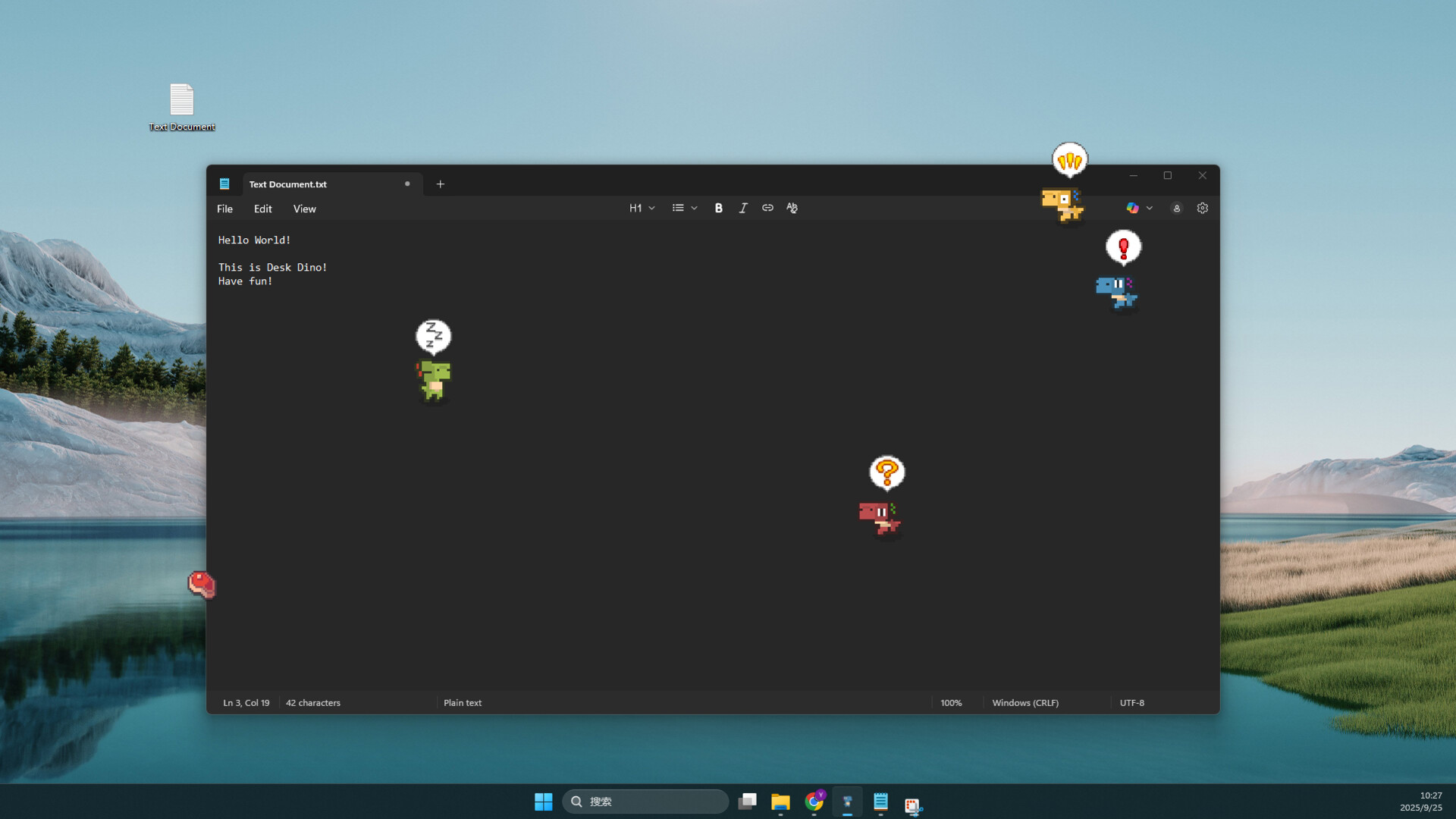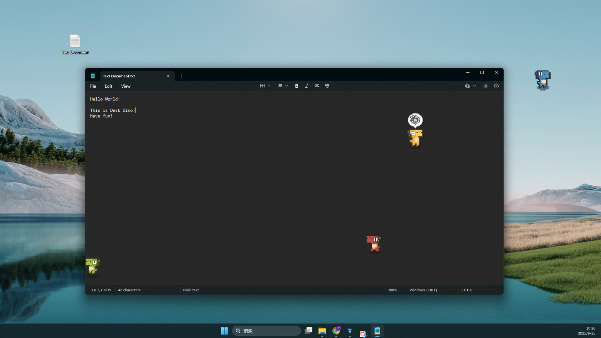 Some naughty pixel dinos run around on your computer desktop, being some good accompany while you're working, studying or relaxing. Feed them or play with them, it's on your mark. Don't worry, they won't bite. Enjoy your dino.