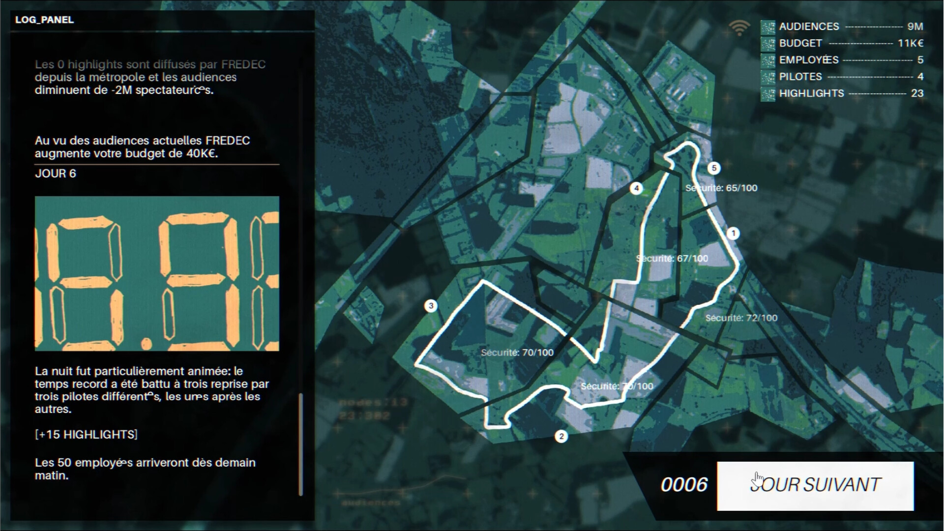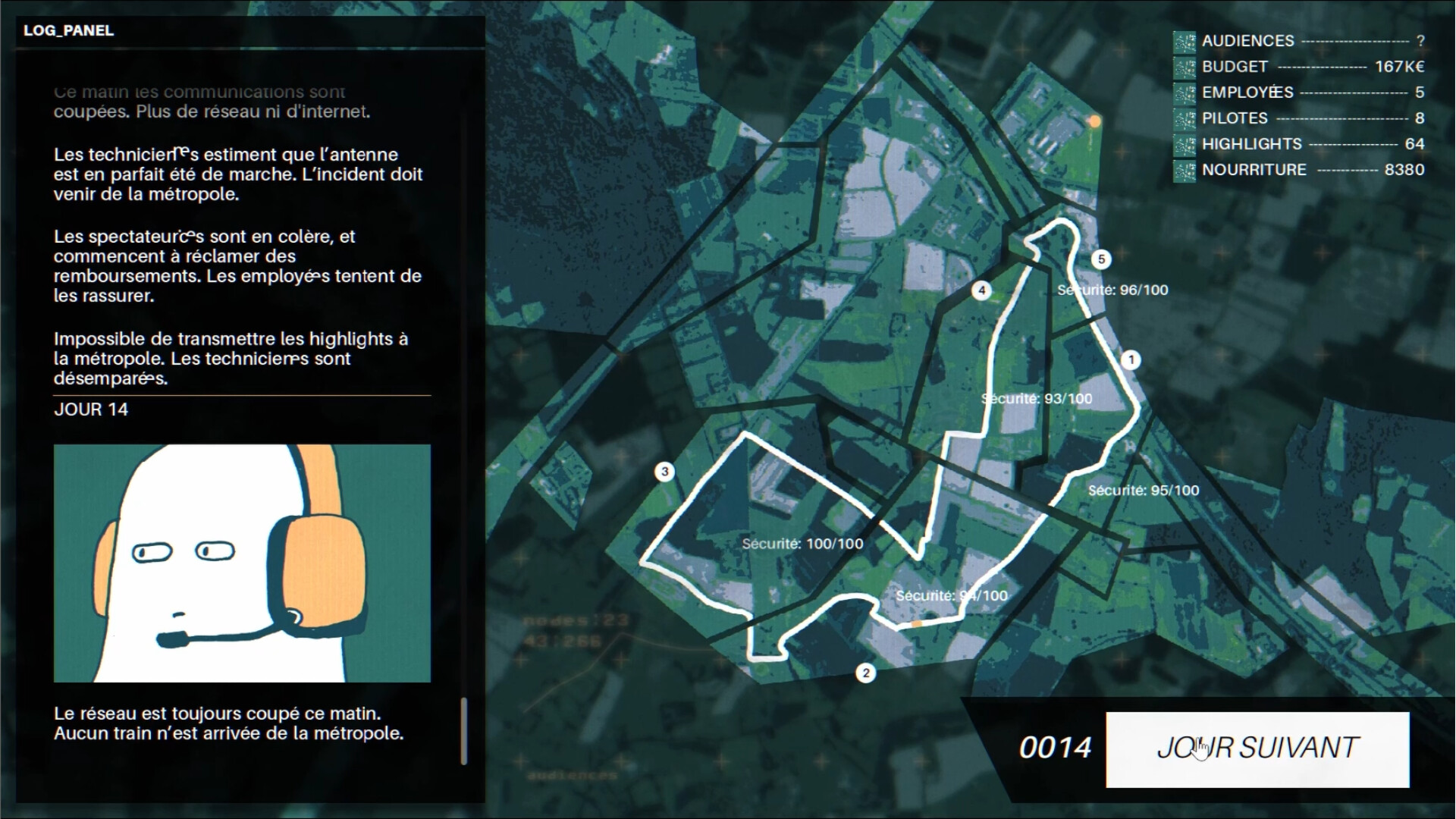 April 14th 2131. The races are going well. There was a minor accident yesterday, nothing terrible. The audiences even went up by 4 millions. I saw a flock of birds take of this morning by the antenna. It was beautiful. Season 31 is a narrative strategy experience about degrowth and embracing change.