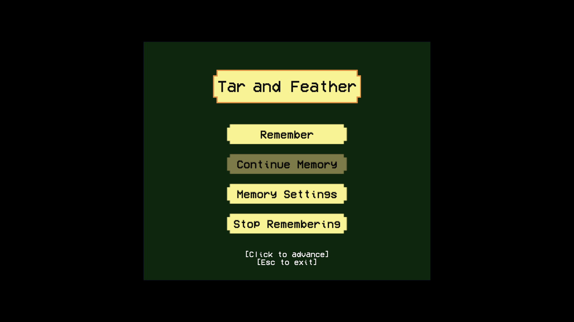 A short story visual novel-like game with a gently interactive narrative and some puzzling mysteries to unlock. Discover how your father got tarred and feathered. Get lost in the memory with ever-corrupting visuals and an immersive soundscape as you make your way to the emu farm.
