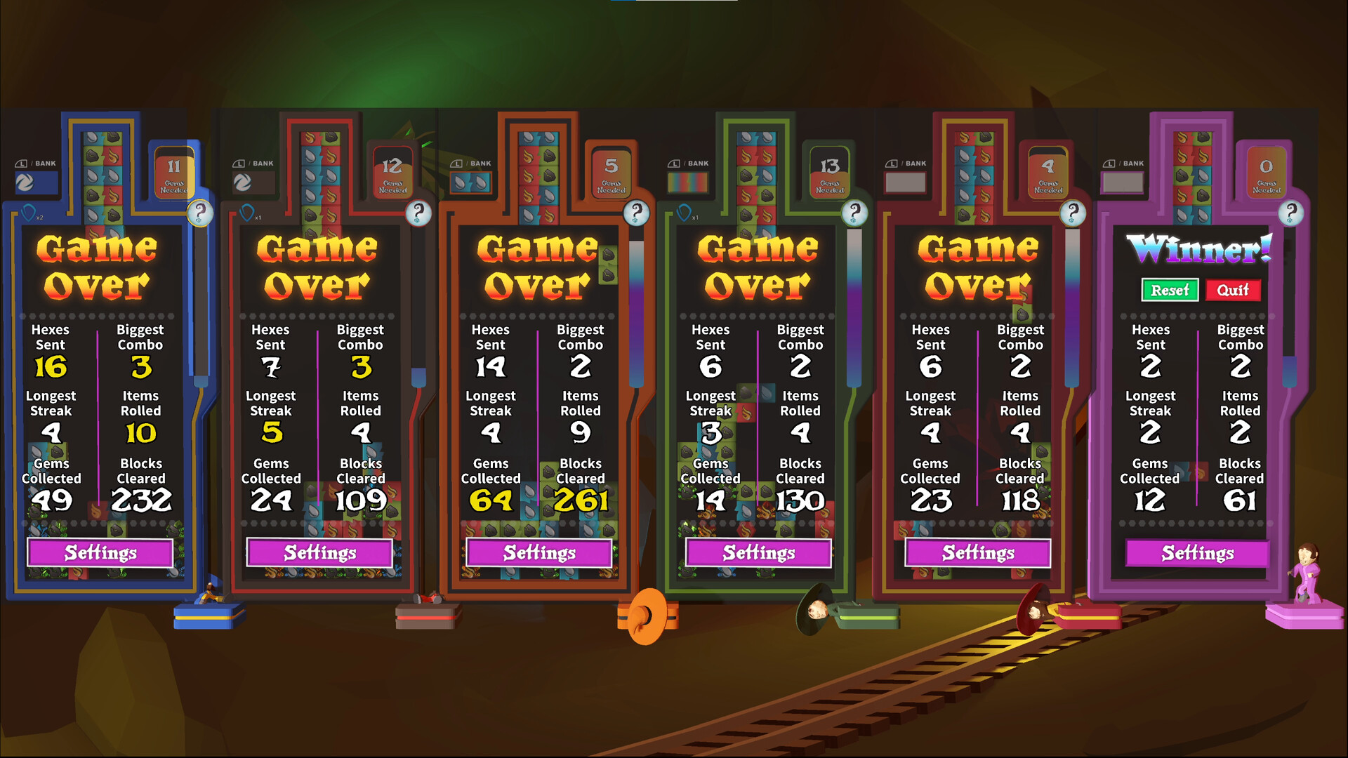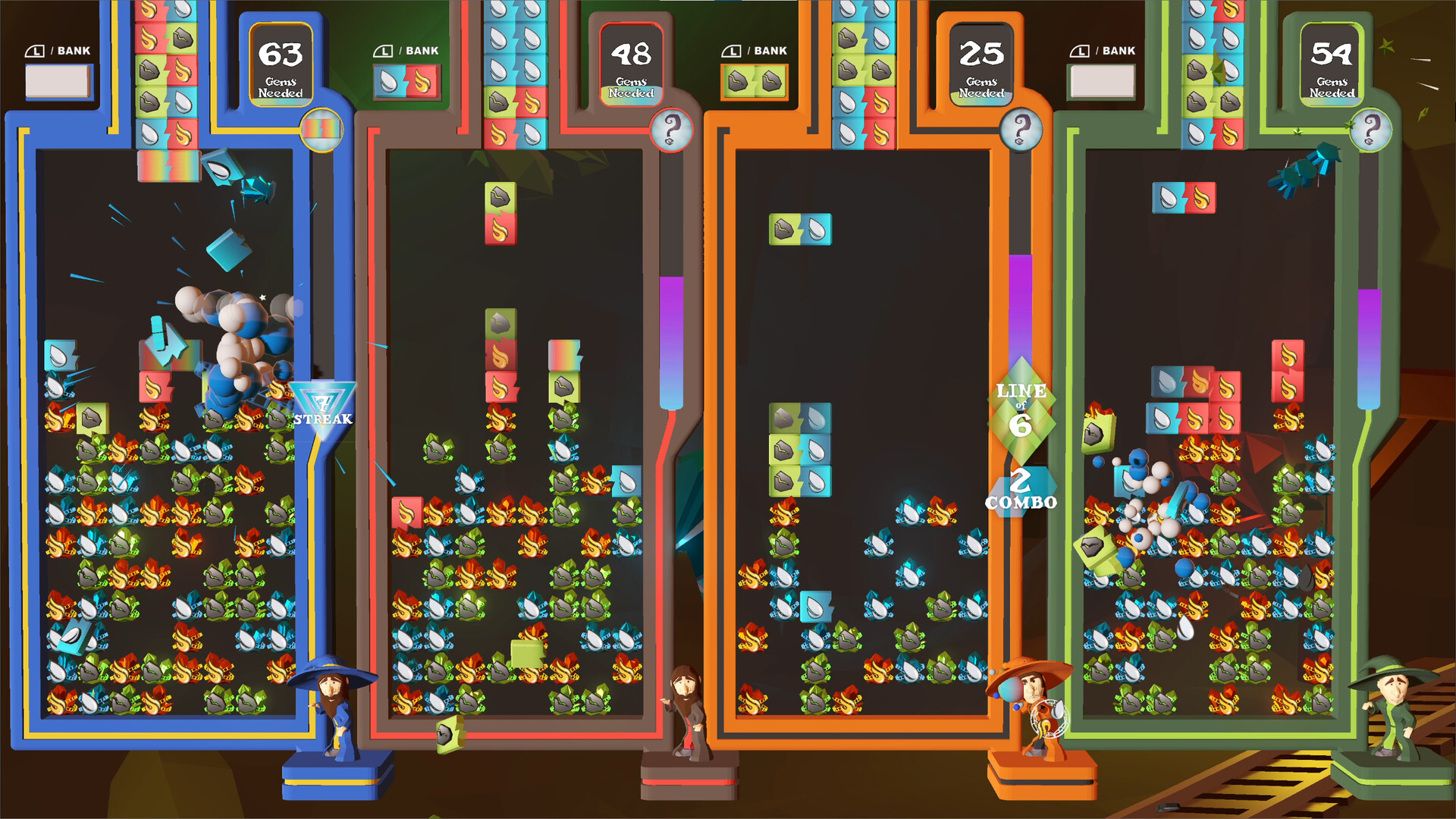 Sorcery Slam is a competitive/party puzzle game inspired by retro era classics. Play with up to 6 Sorcerers locally or online to collect powerful elemental Gems and be the first to power up your ultimate final blast for the win!