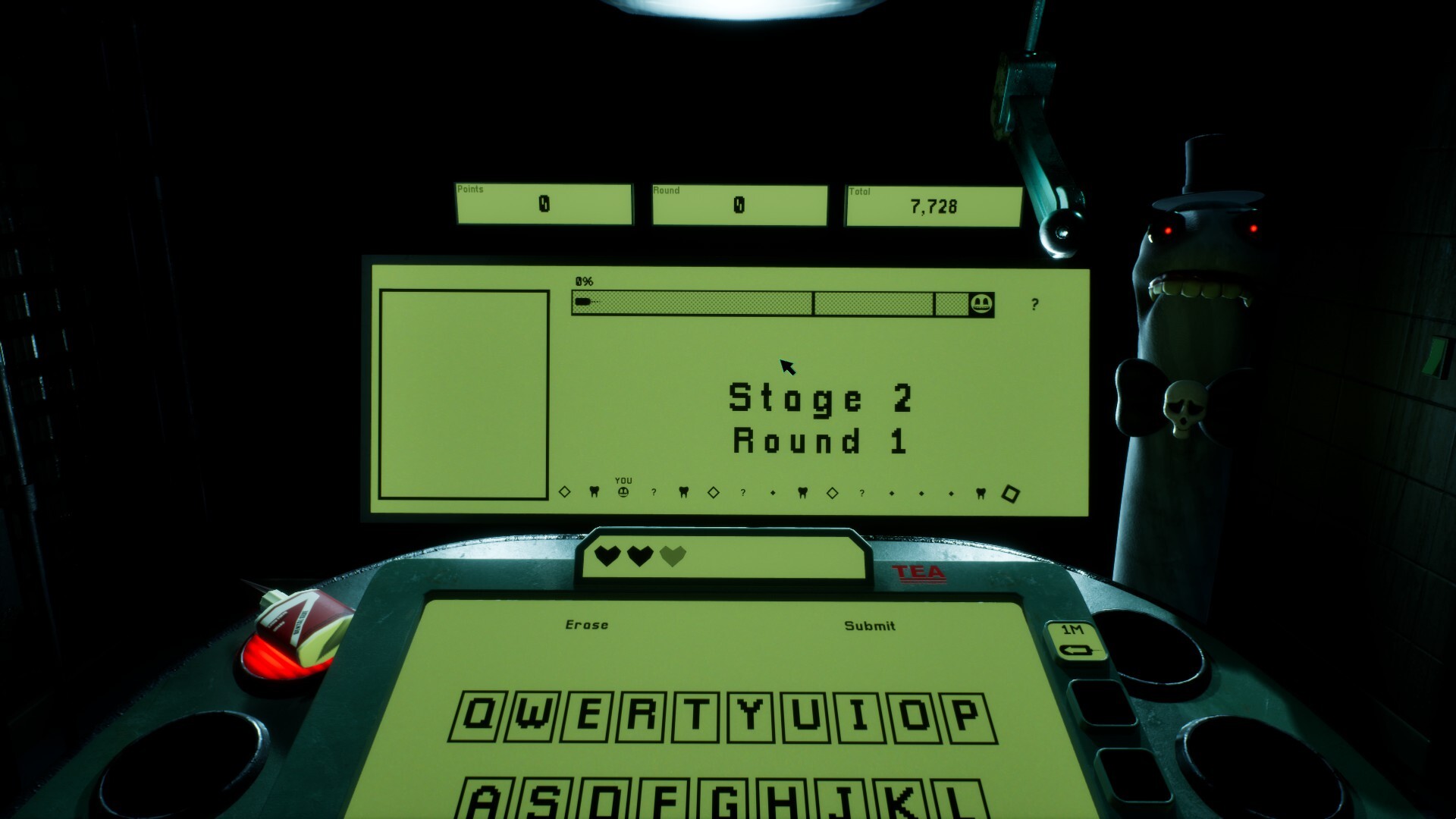 Survive horrific pressure as you try to guess words before being brutally drilled by an esoteric being. Utilizing only your wit and a handful of consumables, can you make it to the end alive?