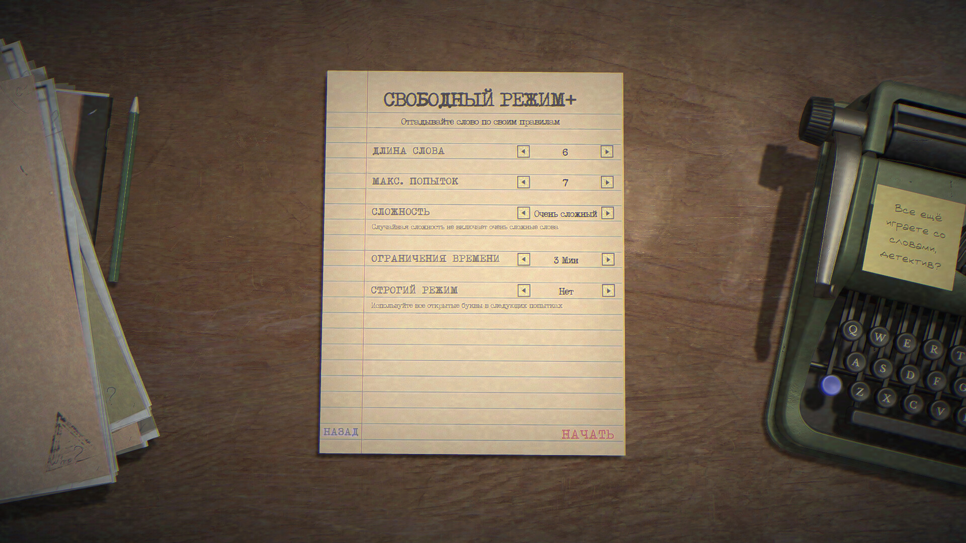 Свободный режим: тренируйтесь с настраиваемыми параметрами — длина слова, сложность, количество попыток и таймер