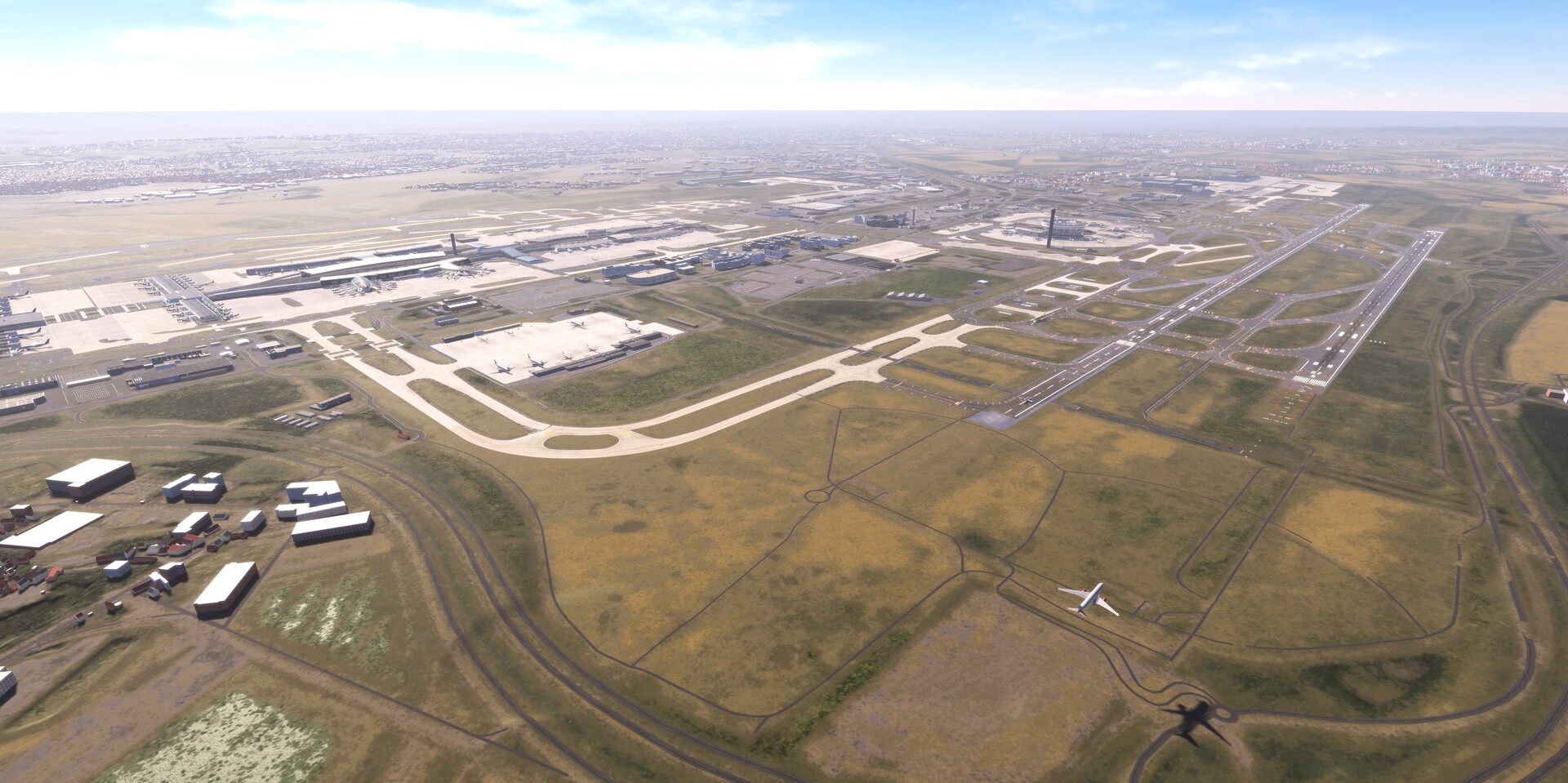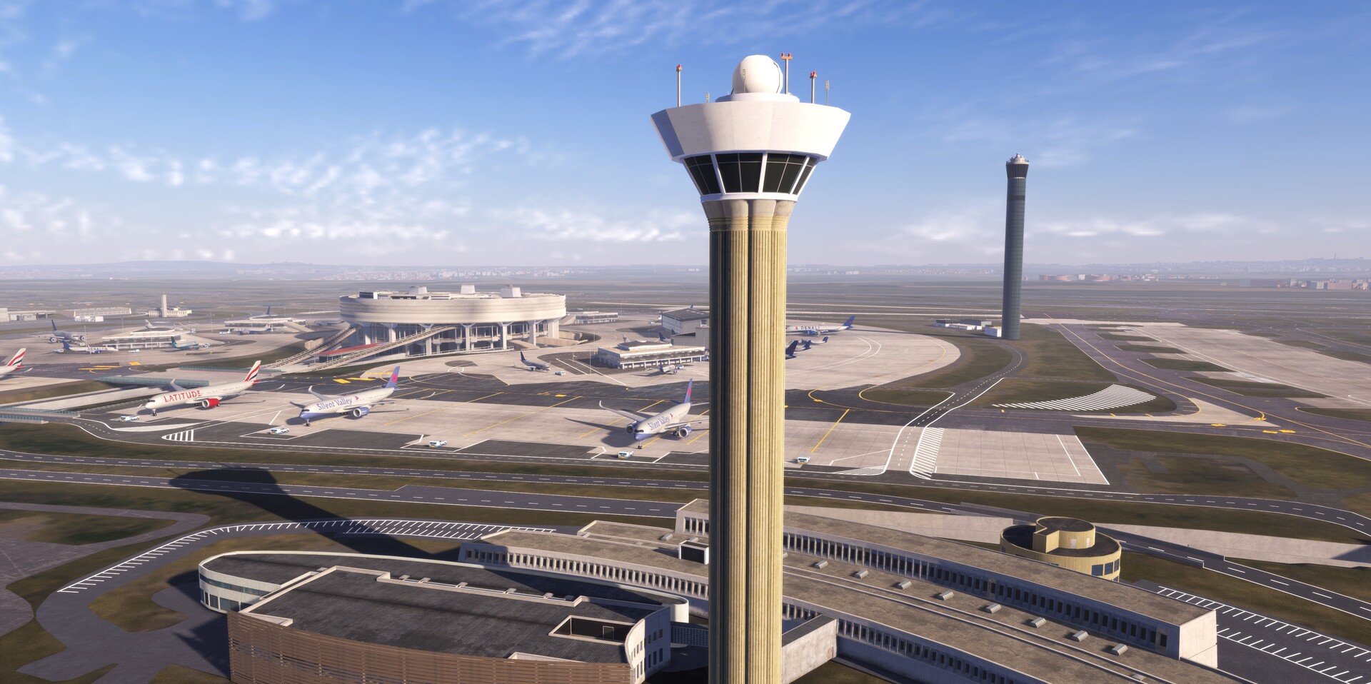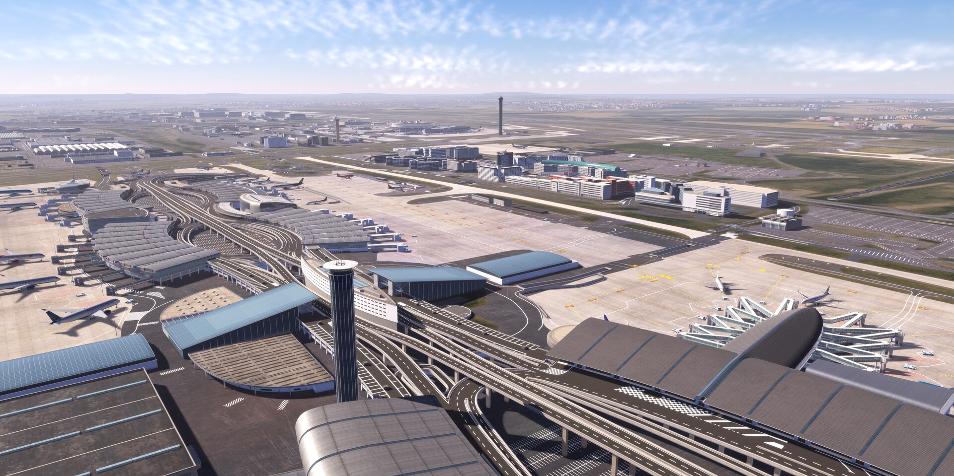 Four parallel runways and a multi-terminal structure with detailed taxiways provide a challenging environment for managing air traffic.