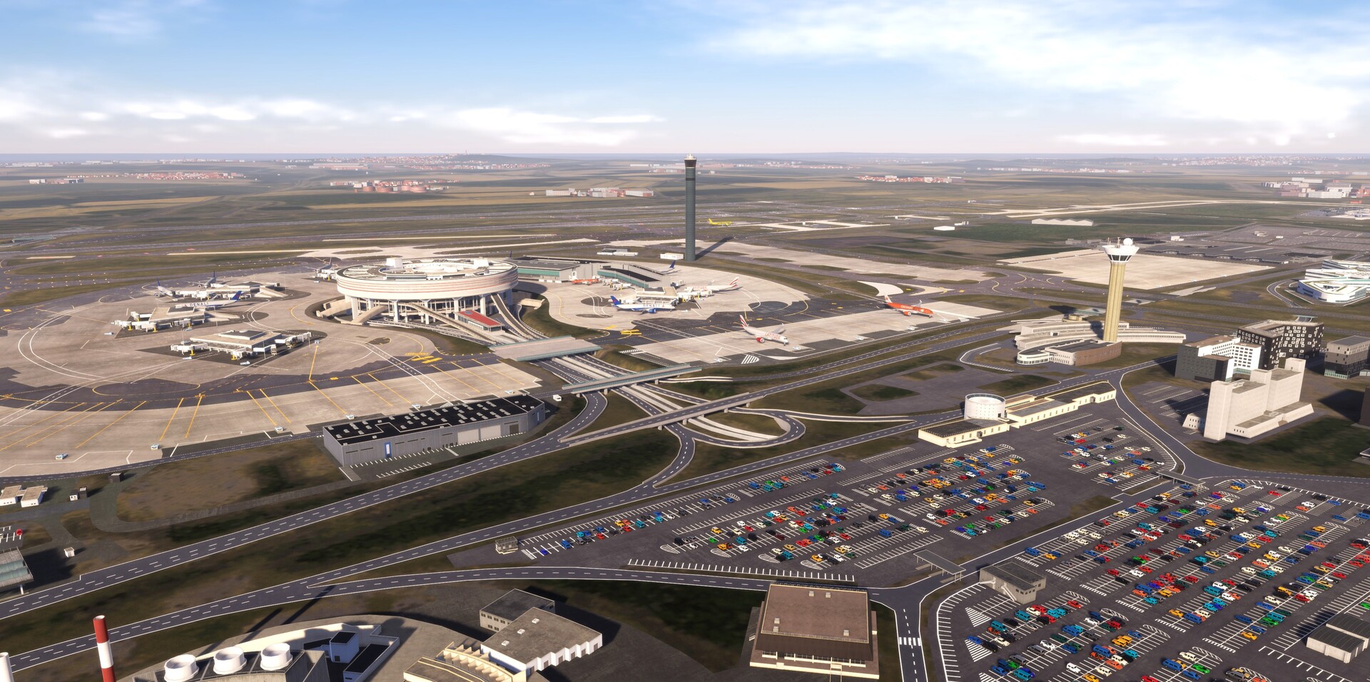 LFPG, or Paris Charles de Gaulle Airport, is a complex and busy international airport ideal for simulator games, featuring a realistic model with four parallel runways, three terminals (including the "village-like" Terminal 1 and seven sub-terminals in Terminal 2), and a detailed ground network. Players can use this add-on to practice air traffic control with features like advanced radar systems, accurate taxiway signage, and detailed ground polygons for precise navigation.