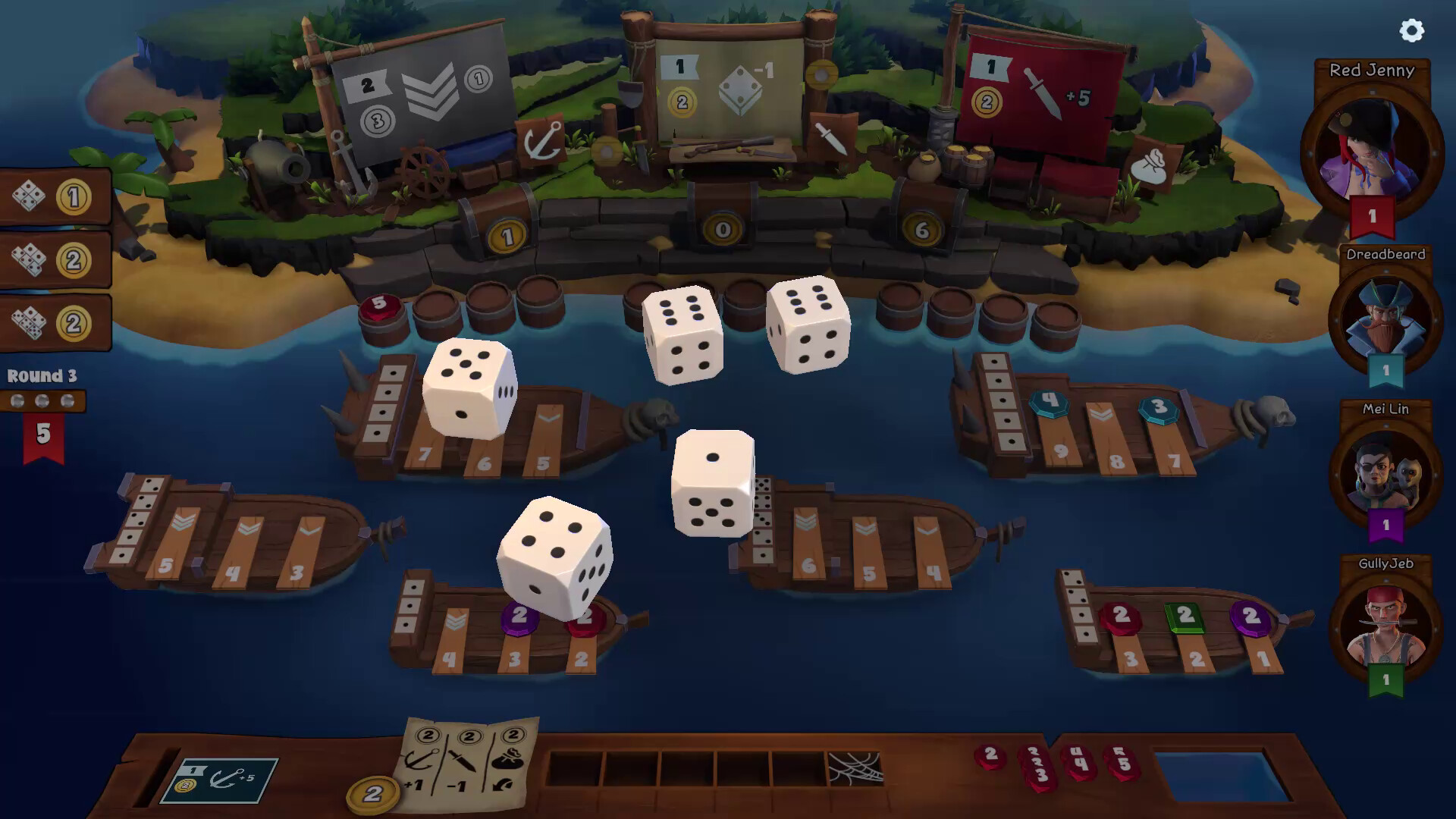 Each round begins with a Yahtzee-style dice roll, followed by careful manipulation and strategic positioning on Ships' or Port positions. Players can push each other off ships, claim bonuses, and adapt to the changing Fleet Bonus Cards introduced at different stages of the game.
