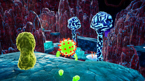A third person, action-adventure game with a medieval and biology style. Explore inside the human body as a COVID-virus fighting your way past enemy white blood cells and immune proteins. Find and infect cells to score points.
