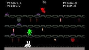 The objective is simple enough for all ages: kick more veggies to Bunny than the other player. Avoid bugs, steal credit from the other player by kicking their veggies, but make sure you don't get eaten by Bunny yourself! Players can kick bugs as well as each other, and kicking a player directly into Bunny's mouth will award bonus points.