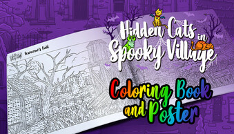Discover the art of Hidden Cats in Spooky Village in a charming Coloring Book and Coloring Poster collection!