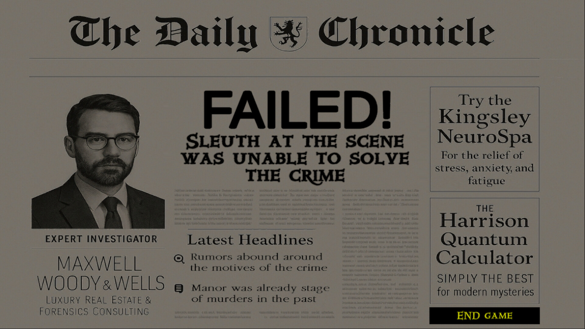 Solve the Case – Get the weapon, identify the culprit, and make the arrest. You have one hour before the police arrives and takes over the investigation, ruining your detective reputation.