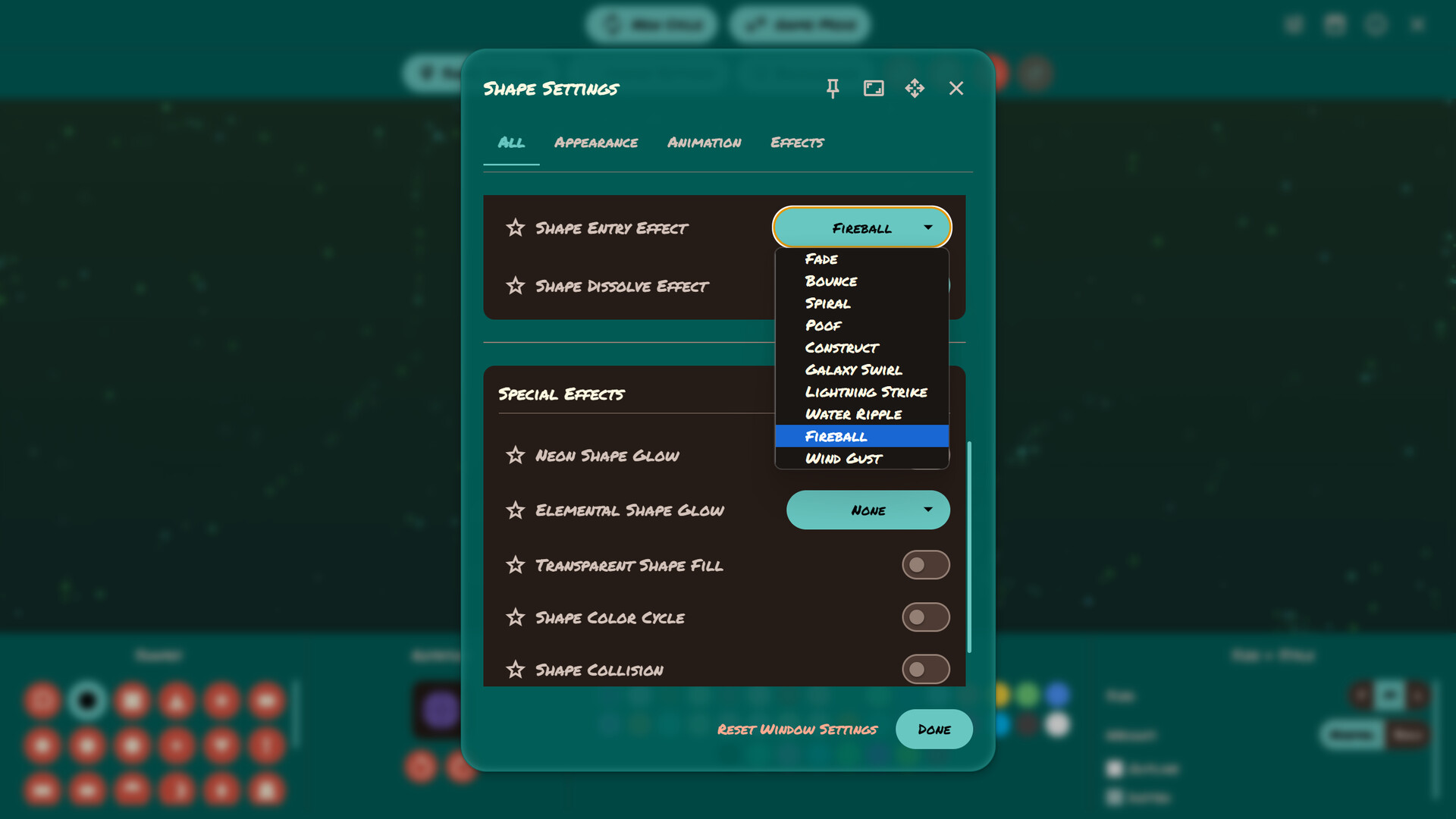 5 Shape Entry Effects: Control how your shapes appear with spectacular new animations, including Galaxy Swirl, Lightning Strike, Water Ripple, Fireball, and Wind Gust.
