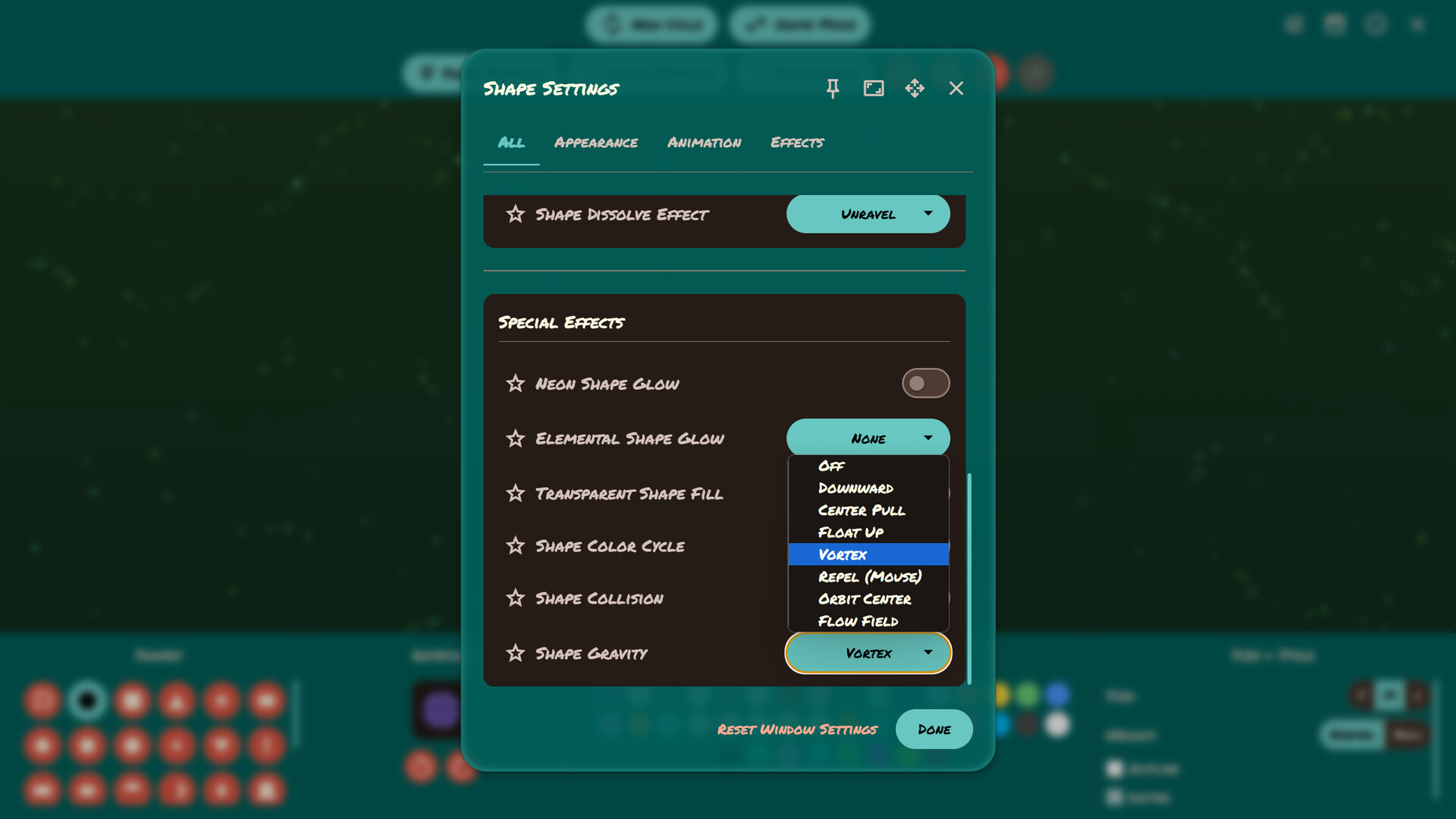 5 New Gravity Effects: Apply unique movement physics to your shapes, such as Float Up, Vortex, Repel (Mouse), Orbit Center, and Flow Field.