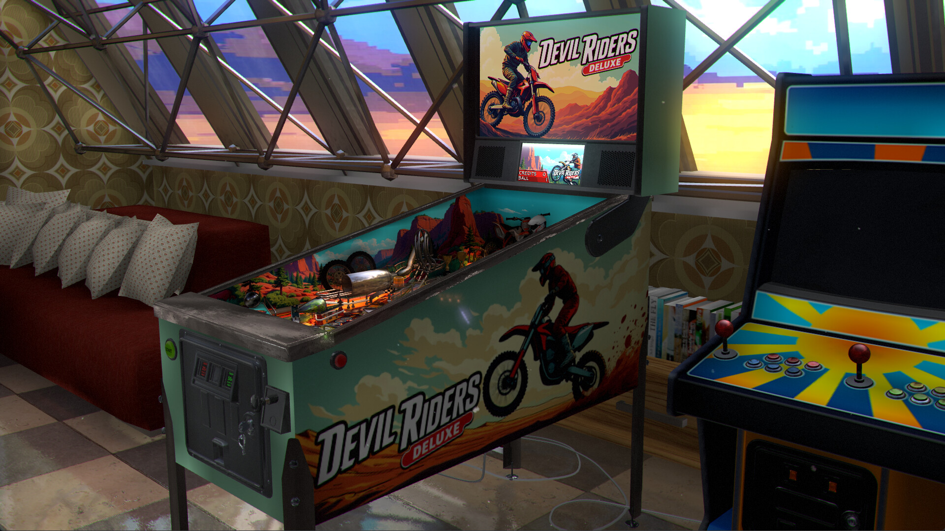 Devil Riders Deluxe table is the original Devil Riders table reimagination with such modern pinball features like LCD display, prism lamps, game and multiball modes, and the secondary playfield.
