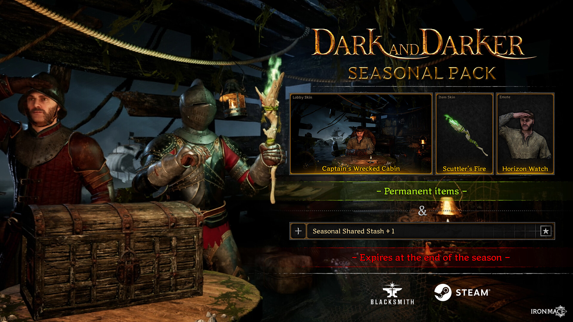 Dark and Darker: РД 7-й сезон уже здесь с новой картой «Кладбище Кораблей» и обновленным сезонным набором, основанным на отзывах игроков! Включает в себя общий тайник и 3 постоянных косметических предмета: «Разрушенную каюту капитана», «Огонь Беглеца» и «Наблюдение за горизонтом».