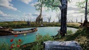 Это исследовательская виртуальная туристическая игра типа VR, первая световая карта: вы можете стоять в космосе, погружаться в космос, чтобы испытать Вселенную, а также узнать о черных дырах, второй уровень: вы можете добраться до эпохи динозавров на лодке, посетить различные динозавры, узнать об их привычках, а также коснуться динозавров правой рукой и взаимодействовать с динозаврами. Конечно, будьте осторожны с тираннозавром, он плотоядный, видя, что вы будете преследовать вас все время, кусая вас большим ртом, когда полоска крови правой руки показывает ноль, очень редко, вам нужно начать с самого начала. Желаю вам весело провести время и узнать знания.