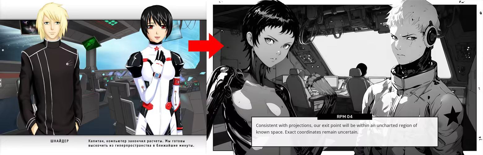 Визуальный стиль игры не имеет практически ничего общего с со старым «Красным космосом». Space is Red, скорее, стилизован под черно-белый комикс. А точно даже под ретро-хоррор мангу. Одна из причин для такого резкого изменения в том, что в «Красном космосе» имел место некоторый разрыв между визуальным рядом и достаточно мрачным сценарием. Сейчас этот диссонанс устранен, и достаточно очевидно, что это хоррор, а не симулятор свиданий.