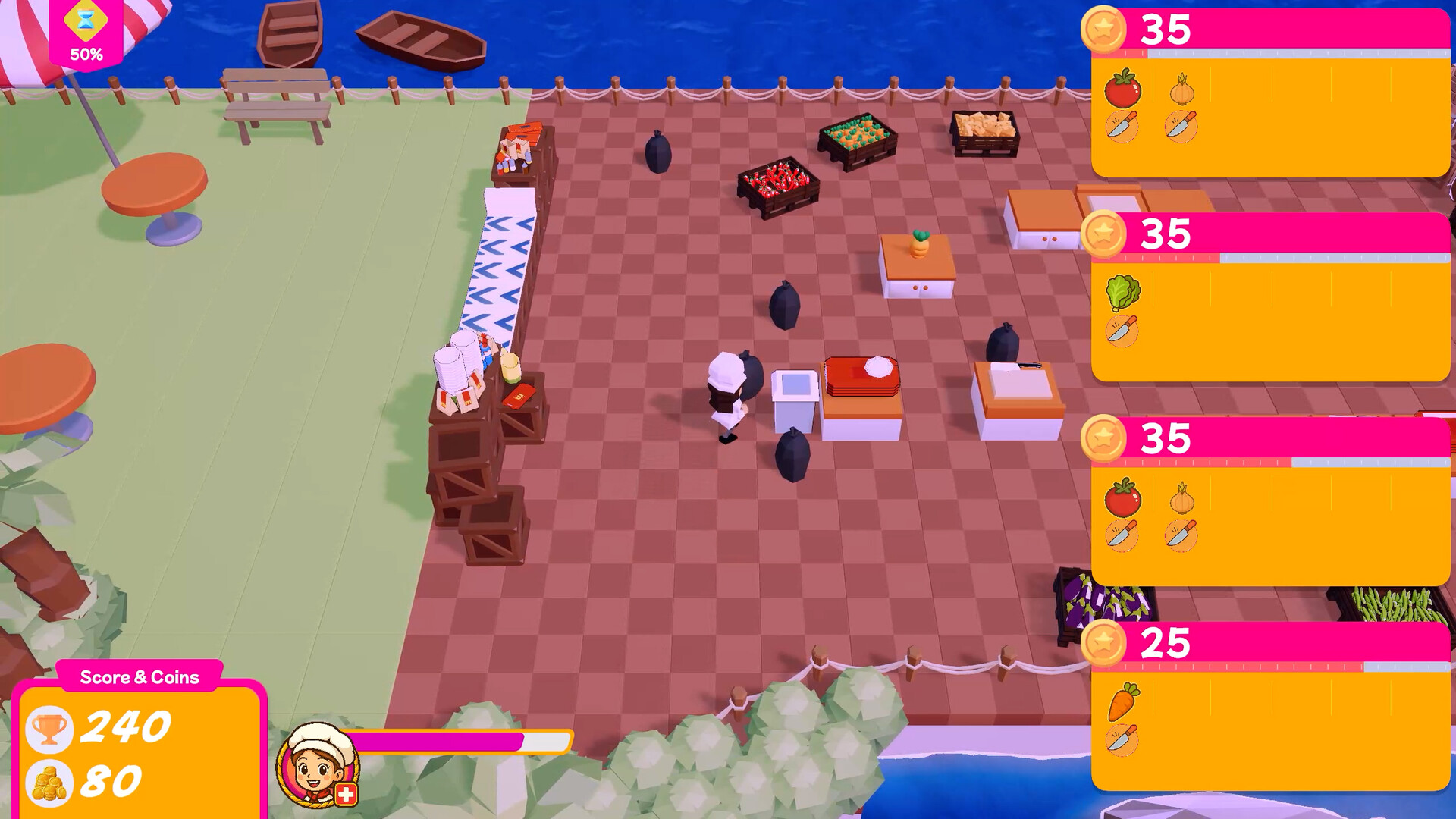 A cute, chaotic top-down kitchen rush: deliver orders, slap thieves who steal your coins, and sink pirate ships with ingredient launchers. Earn money, unlock stations, and endure an ever-faster pace across every chapter.