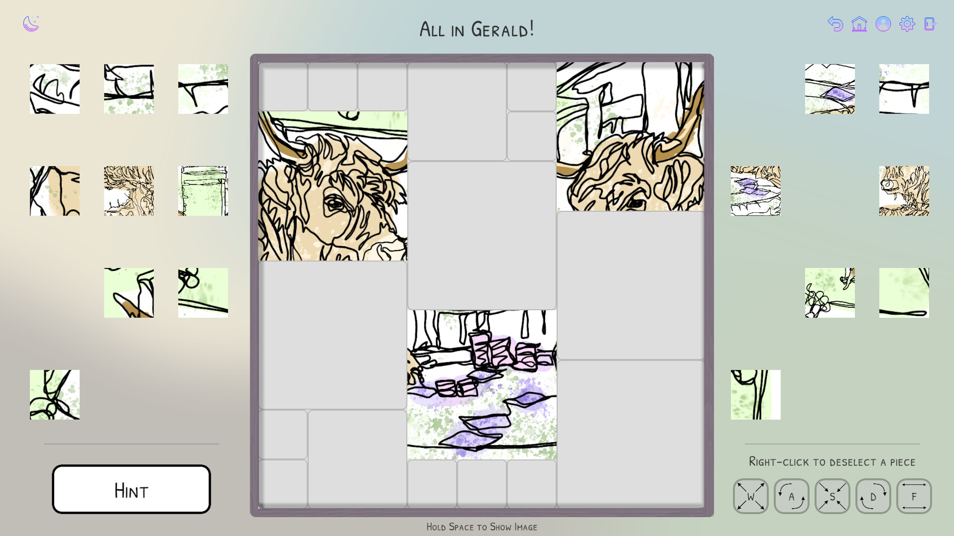 A cozy jigsaw game with a twist; every piece is the same shape, but not the same size! A low-pressure experience with chill piano music and gorgeous hand-drawn line art.
