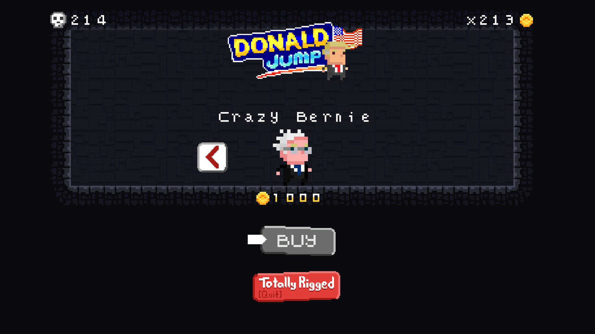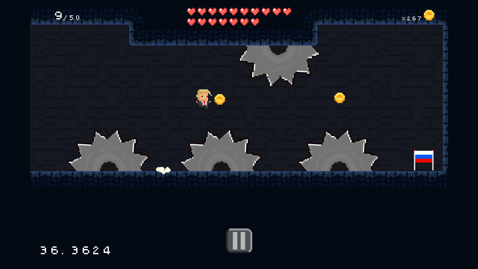 Donald Jump — это брутальный точный платформер на одну кнопку, который проверит твои рефлексы и терпение на прочность. У тебя всего 10 жизней, чтобы пройти 50 коварных уровней, созданных, чтобы сломать твой дух (но ты все равно снова нажмешь «перезапуск»). Сможешь ли ты перепрыгнуть через хаос?
