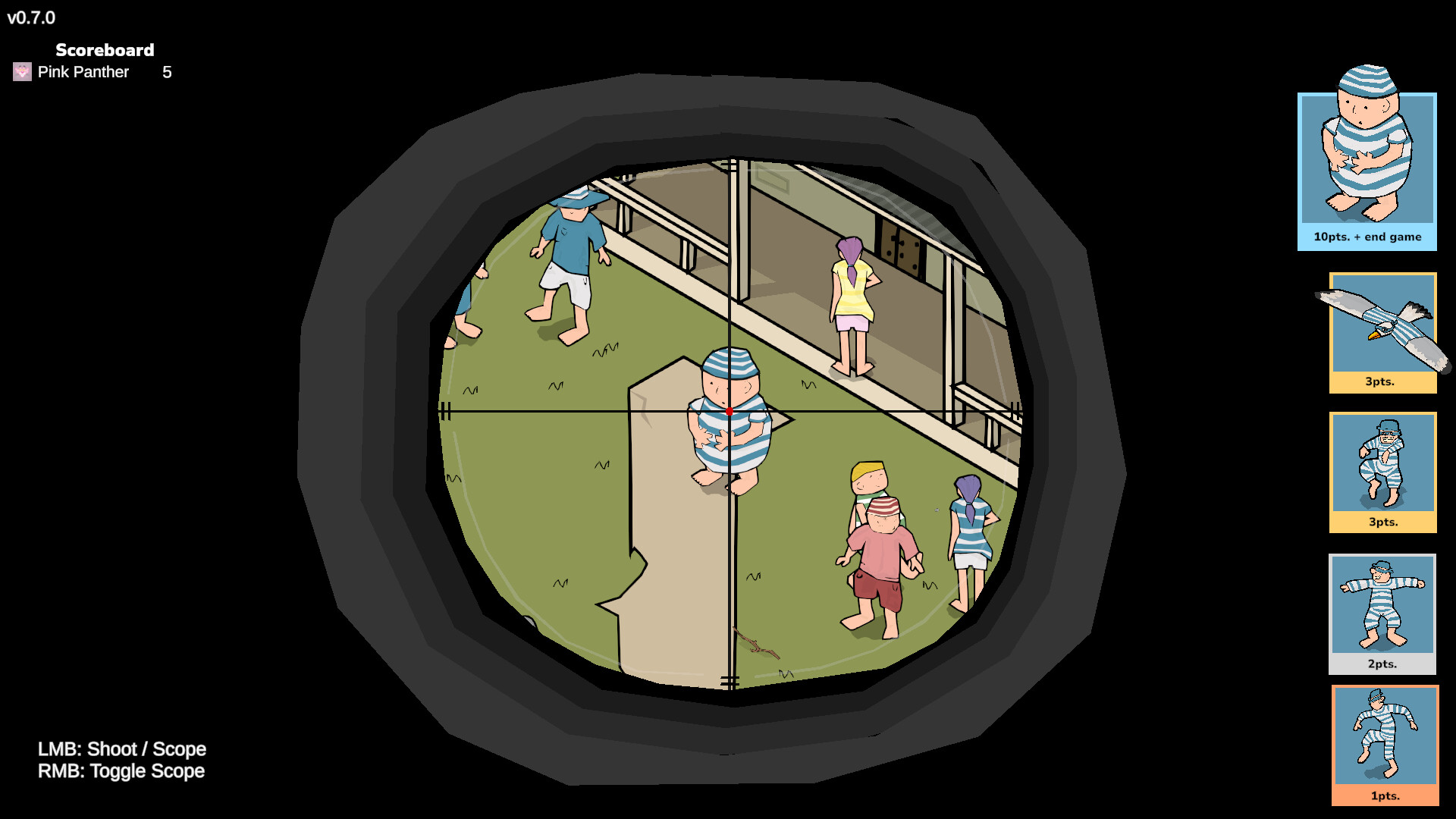Kill Wilbo is a fast-paced multiplayer PvP game where players compete in a vibrant, cartoon-style crowd scene. Use your sniper scope to find hidden targets, score points, and end the match by taking down the elusive Wilbo. Precision, speed, and strategy decide the winner!