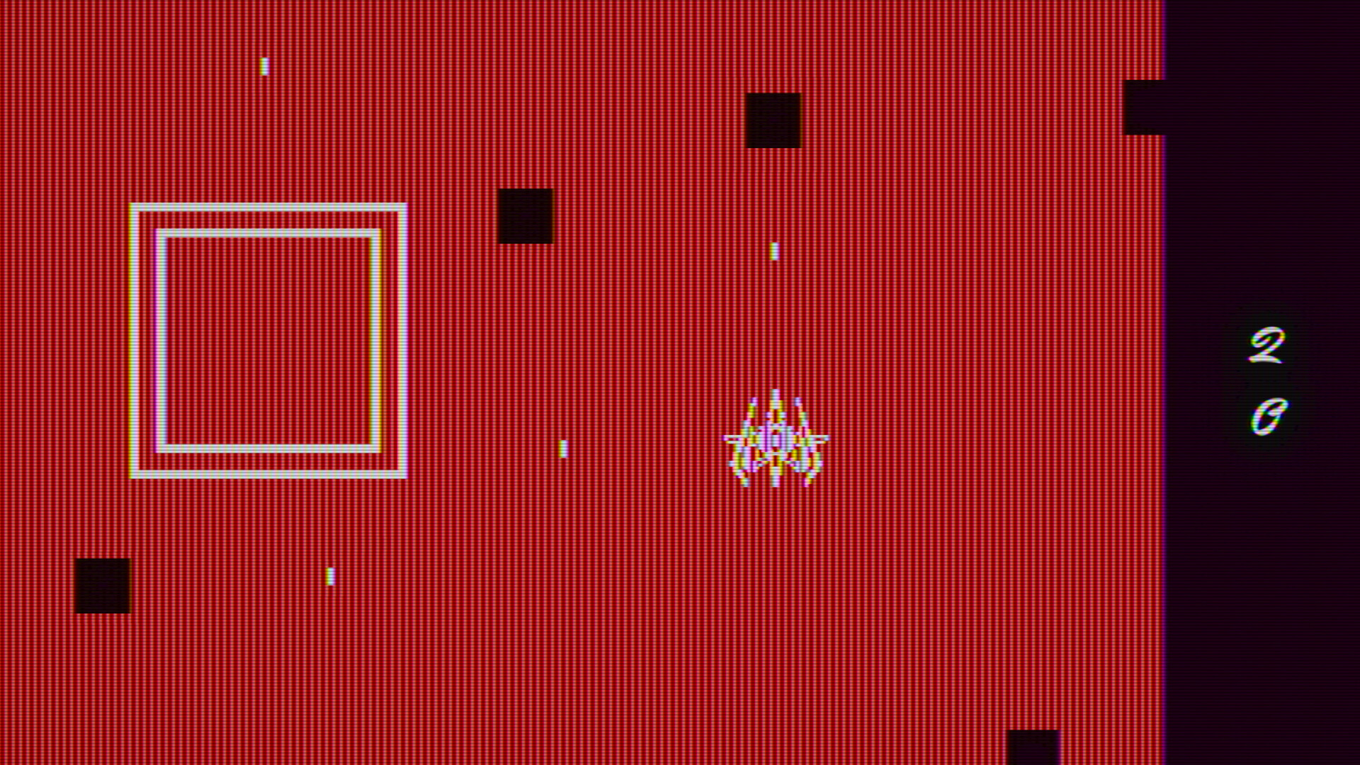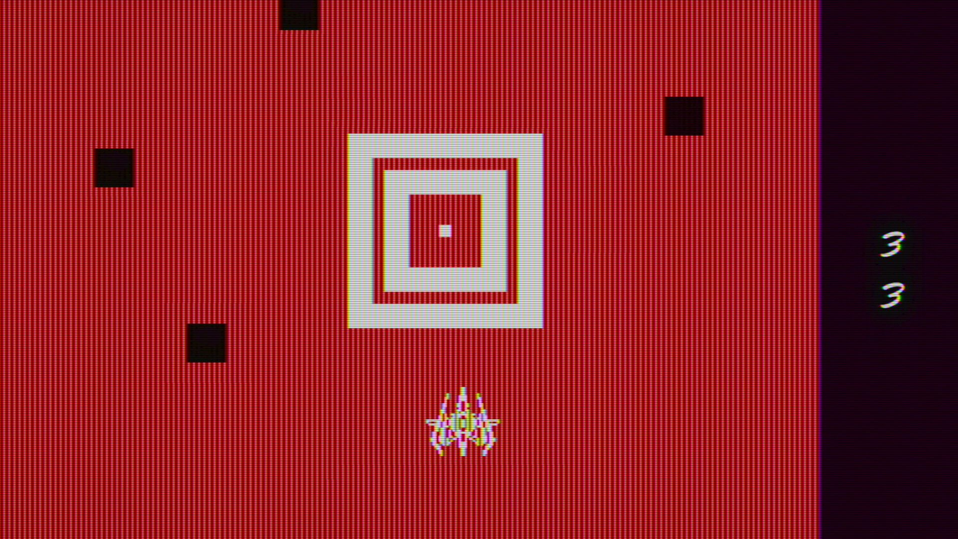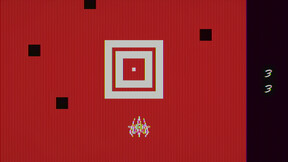 In this shoot 'em up mini game, destroy all 33 white blocks without getting hit by any of the black blocks. You have the ability to warp from one side of the field to the other, vertically and horizontally. The bullets you shoot warp vertically, but only warp into the field once. The ability to warp yourself and the bullets could be handy in difficult situations!