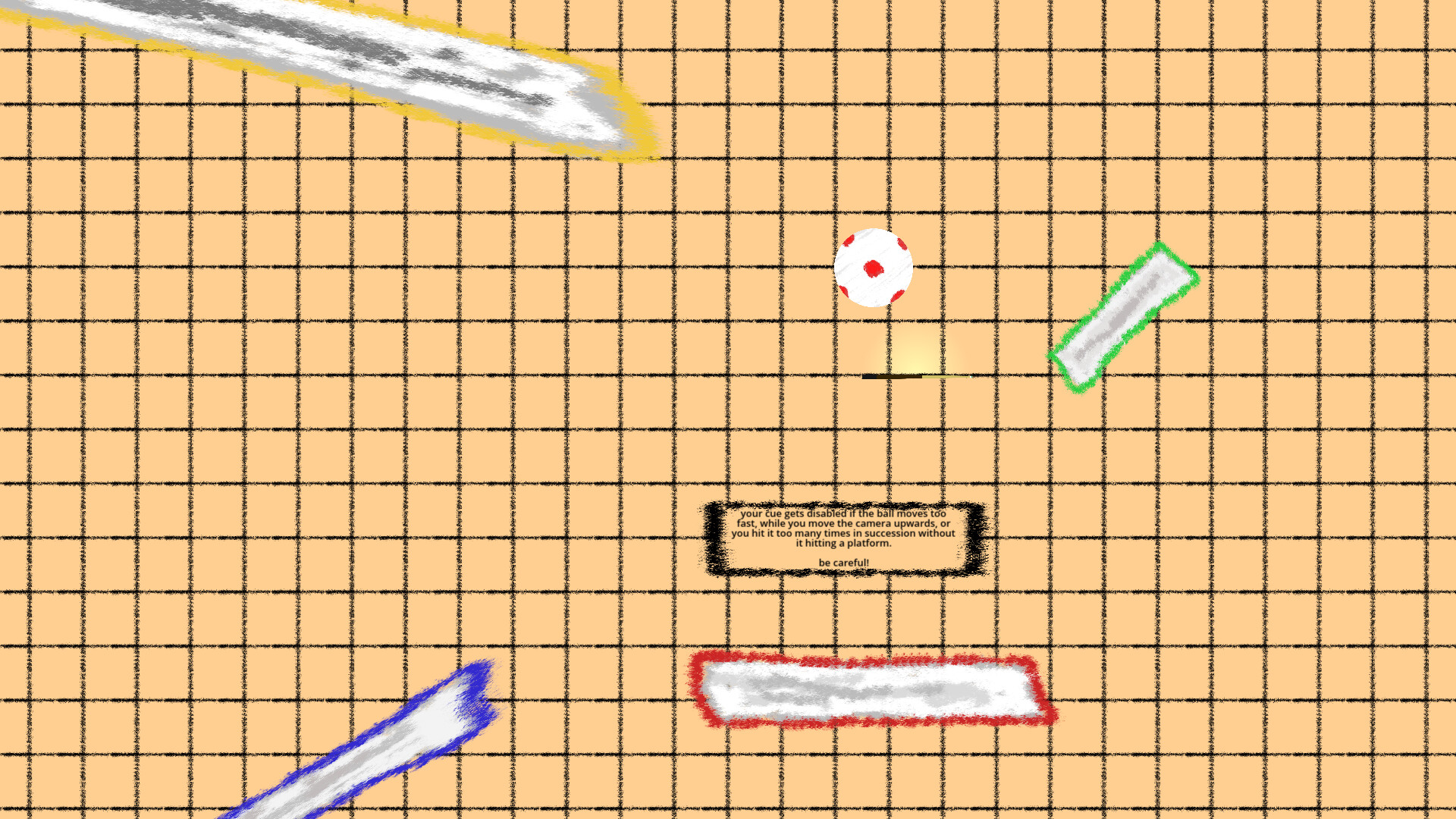 in scratched! you slowly but surely push your cue ball of a series of platforms using a cue. platforms that the ball can very easily roll down on, all the way to the bottom. there are no checkpoints. success in scratched! requires learning how to handle your ball and your cue to push at the exact right position at the exact right time. in other words, it's time to put the work in.
