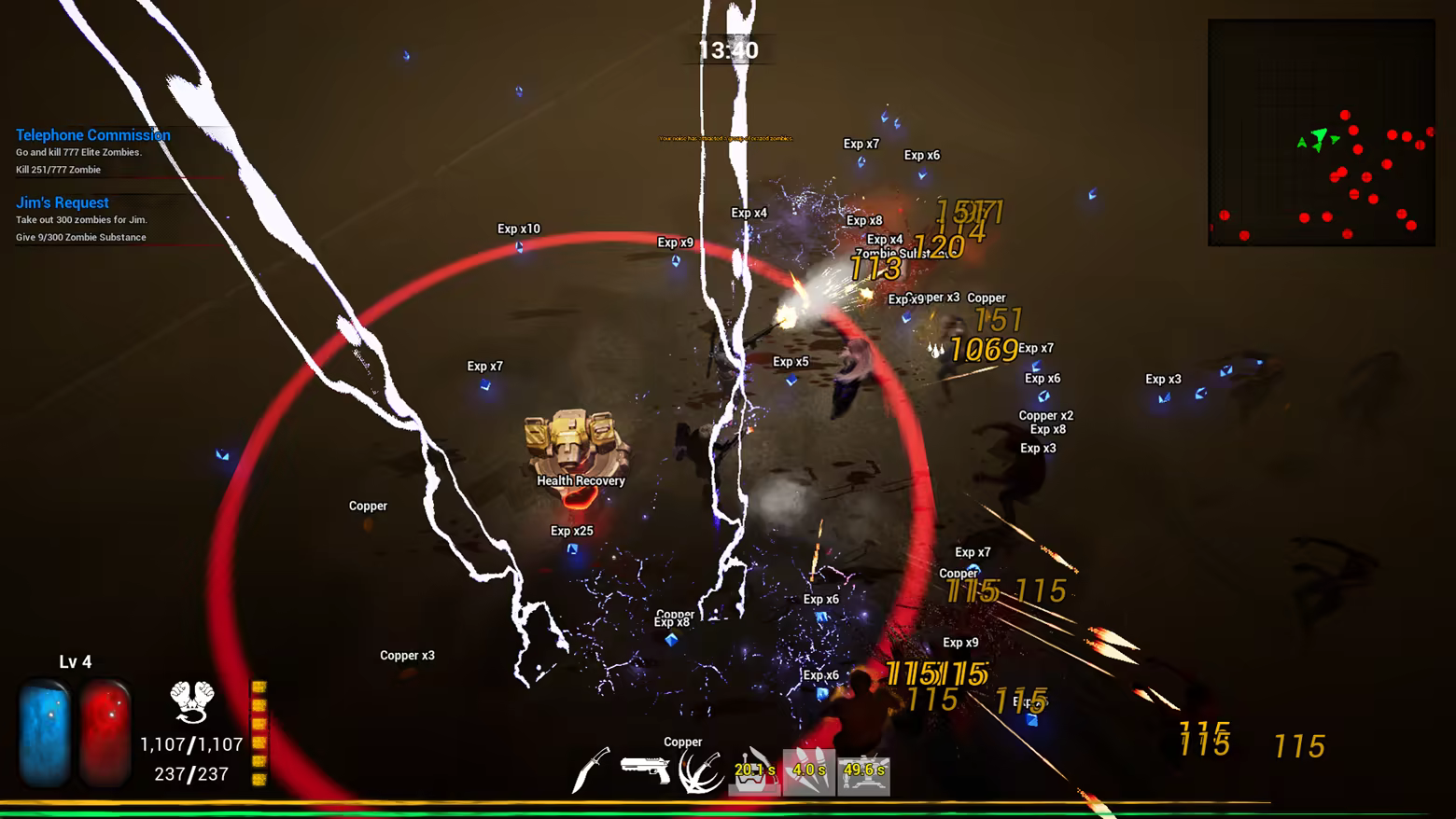 Положительная оценка авансом, на данный момент игра на 3/5 и проблем достаточно много. Плюсы: +Можно пауза в любой момент, играть практически одной рукой и без наушников/звука в целом, т.е. подходит для времяпровождения где-то, где играть не положено (на вахте ночью, на работе и т.д). +В целом, простой и не напрягающий геймплей, подходит для развлечения, когда думать не хочется вообще. +Периодически может генерировать развлекающие ситуации и подарить чувство удовлетворения успешной зачисткой или выживанием в напряжённом месте. +Несмотря на вакханалию эффектов и тонну объектов на экране - работает стабильно и не лагает (при включении видеокарты, разумеется) Плюсы звучат сомнительно, но это далеко не худшее, во что можно поиграть и в целом всё неплохо. А теперь о минусах. -При каждом запуске приходится включать видеокарту в настройках. Почему на настольном компьютере с полноценной дискретной видеокартой игра не использует видеокарту по умолчанию - загадка. Без этой настройки лагает страшно. -Перевода на русский язык можно сказать, что нет. Он очень корявый и машинный. Ещё и с проблемами шрифтов. Поэтому, для комфортной игры надо оставлять английский. Знания английского требуются самые базовые, однако, то, что перевод заявлен, но играть с ним неудобно печалит. -Не самый удобный интерфейс. Мелкие иконки модулей и чипов. Мелкий интерфейс в целом. Инвентарь, разбитый на страницы. Настройки клавиш, в которых не видно, какая кнопка назначена, если использовать что-то нестандартное (дополнительные кнопки мыши, нумпад) - у кнопок слишком длинное название, которое не помещается в поле. Сравнение модулей усиления (которых 10 штук) идущее поверх всего остального интерфейса (при сравнении в меню торговца может прятаться кнопка продать). Миникарта для галочки - нет ни границ карты, ни стен помещений и заборов, за которые можно зайти + небольшая дальность радара. -Отсутствие фильтра лута. Постоянно вычищать инвентарь от белых и синих редкостей на уровнях выше 20-25 надоедает. А выпадает очень много всего и часто. -Очень плохая читаемость поля боя. Всё в объектах (опыт, монеты, лут) и покрыто сверху эффектами. Таймерная взрывчатка+гранаты+зажигательные гранаты+способности = какофония на экране и банально не видно зон атаки боссов которые тоже где-то там отрисовываются (и это одна из самых частых причин ваншотов заодно). -То ли нелинейная, то ли сломанная сложность. Где-то до 15 уровня можно чуть ли не стоять на месте, выкашивая зомбей сотнями. А после начинаются пачки боссов, которые ещё и снижают хп в % от своей численности, а где-то с 20 уровня ещё и происходит ваншот, если попасть в зону их атаки. Хотелось забрать все достижения стима, но максимально доходил до 37 уровня и совершенно не понимаю, откуда взять ещё больше урона. По итогу: если игру брать со скидкой и нравится подобный жанр - то приемлемо, но ожидать какого-то вау-эффекта или чего-то нового не стоит.