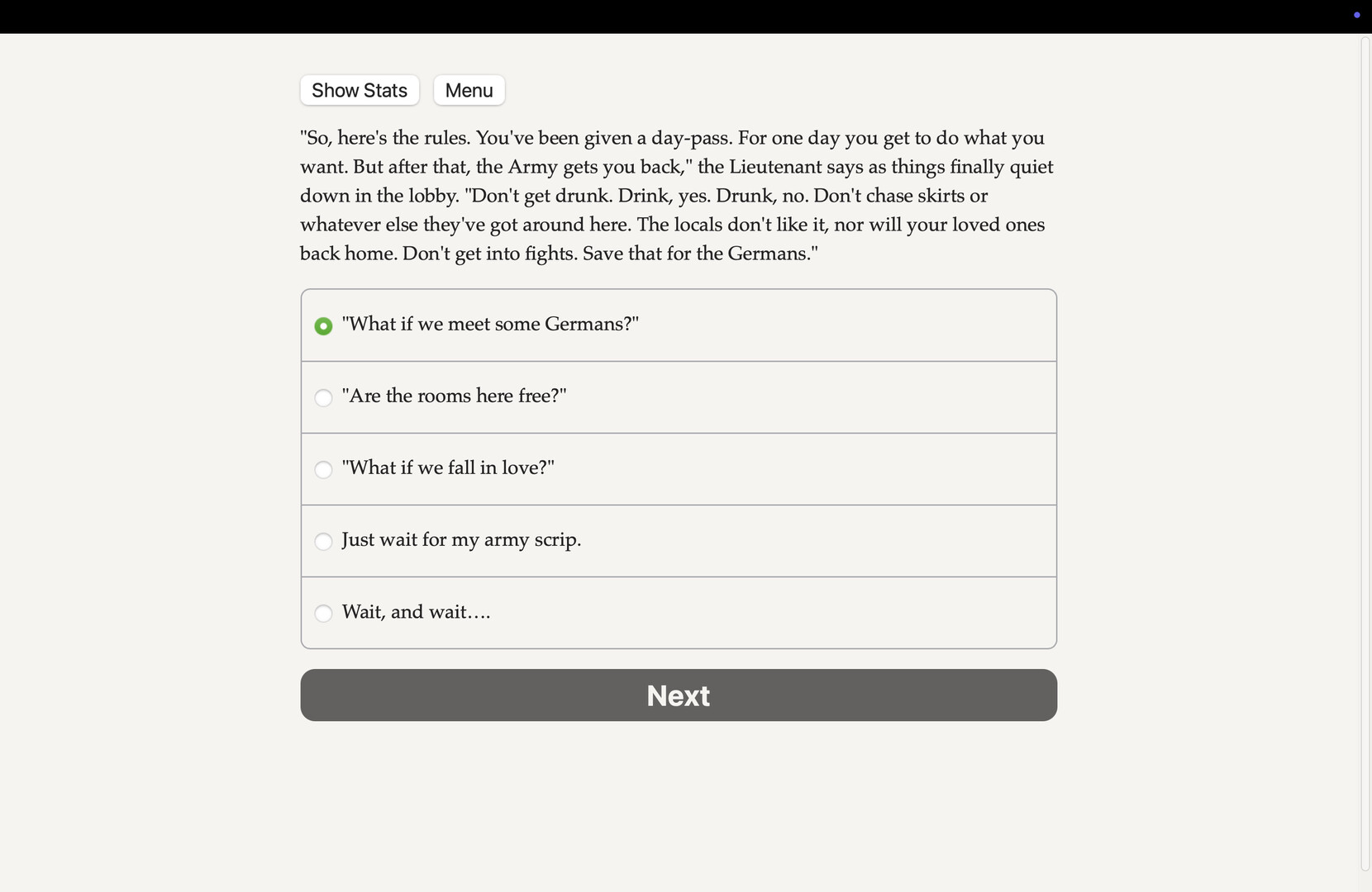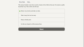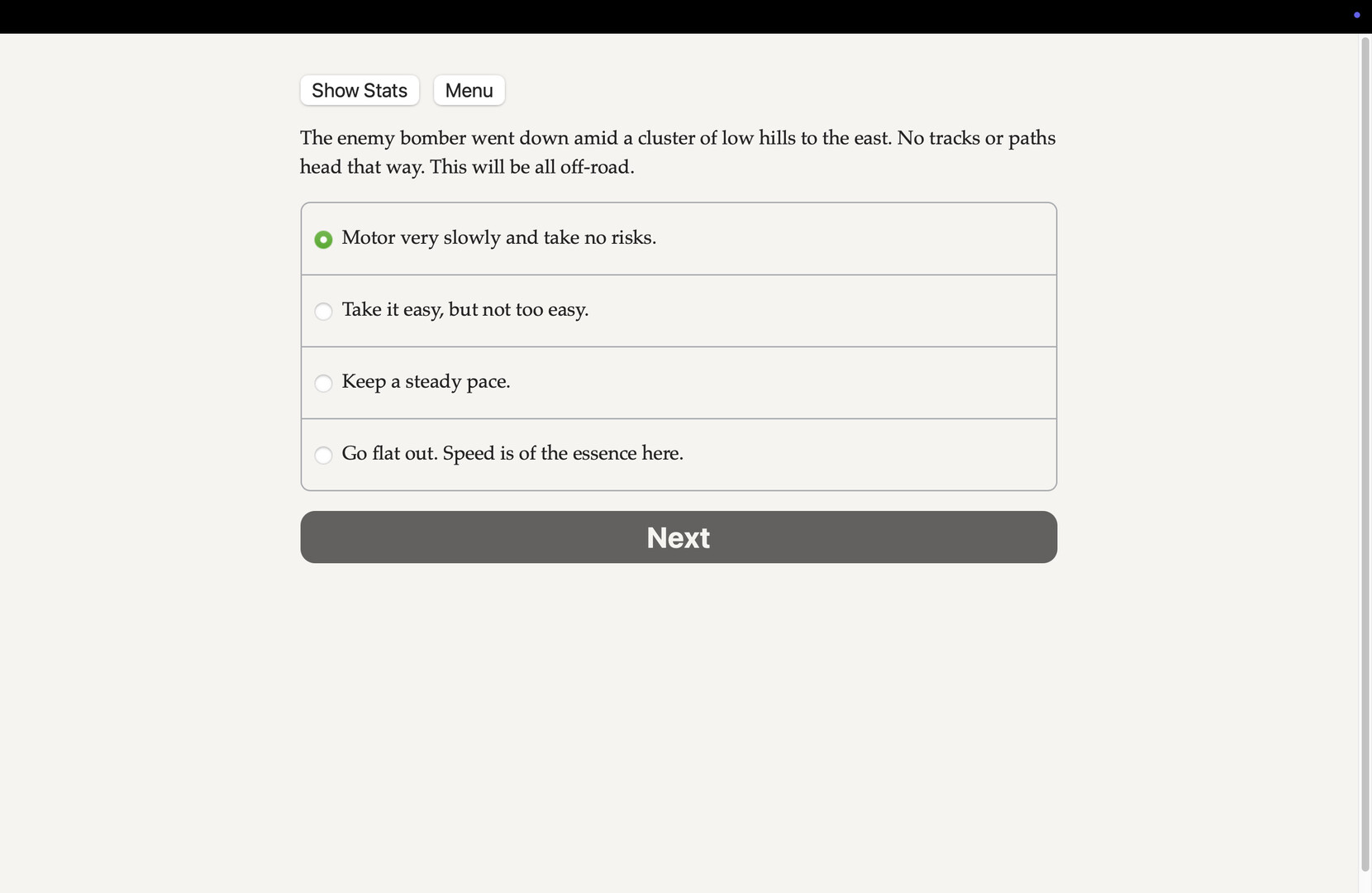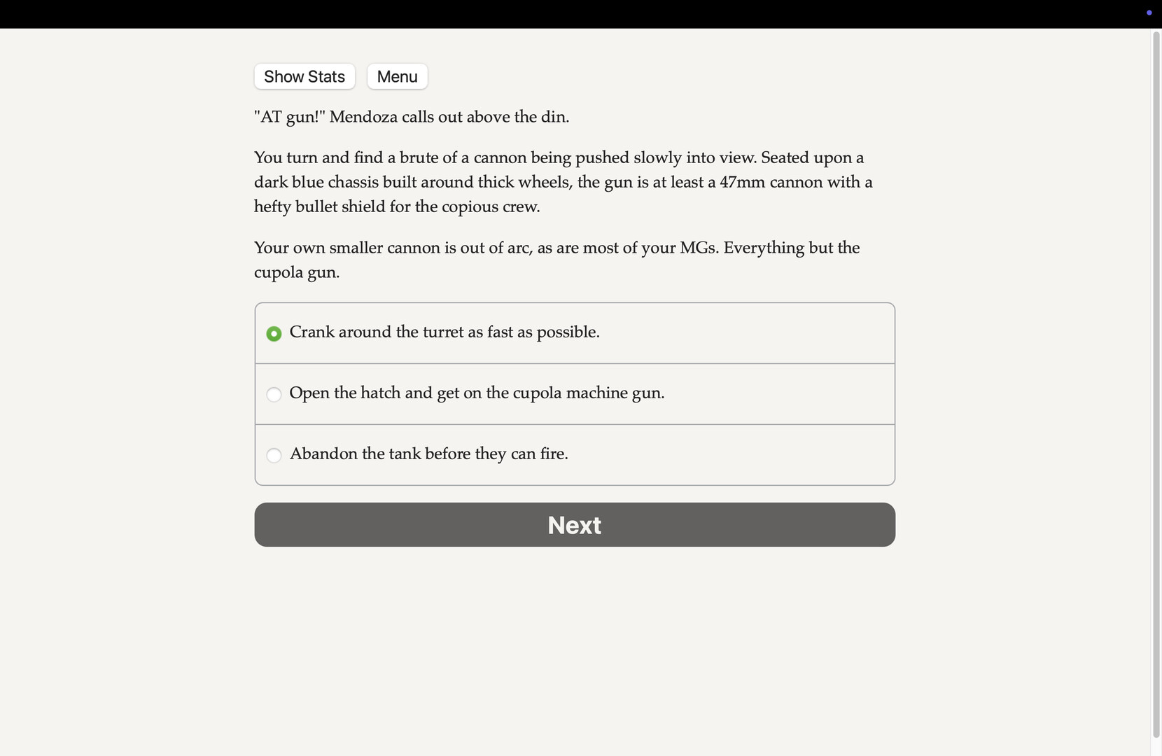 North Africa, 1942. Command a U.S. tank. Lead your men against the Axis powers. Learn the hard lessons of war. The odds are against you. A text-based historical novel, 900,000 words and hundreds of choices, without graphics or sound effects.
