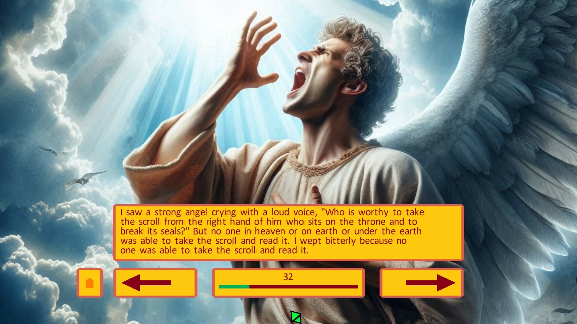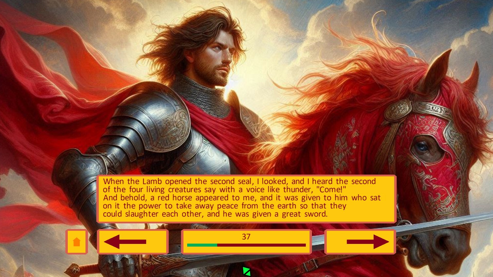 This is the narrative of the Apocalypse of John, the last book of the Bible, told with the use of images pre-generated by artificial intelligence and accompanied by a short caption.