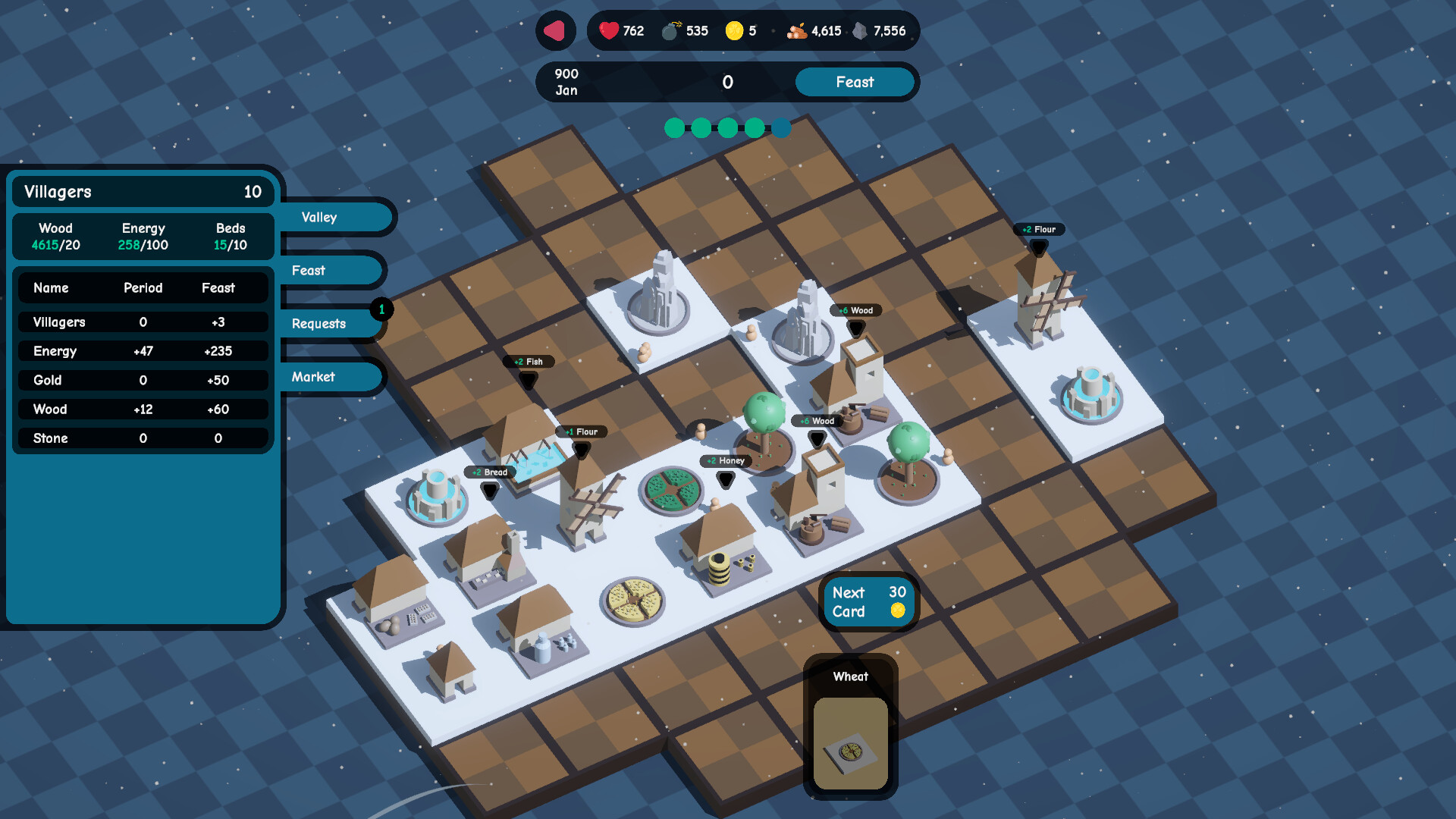 Feast Valley is a strategy game focused on managing food and resources and feeding villagers to keep your village alive. At the end of each month, you must provide food, beds, and basic resources through the Feast menu. If you fail to meet the needs of your villagers, Lives will be deducted, which may result in losing the game. However, if you succeed, you will earn a certain amount of gold for each villager.