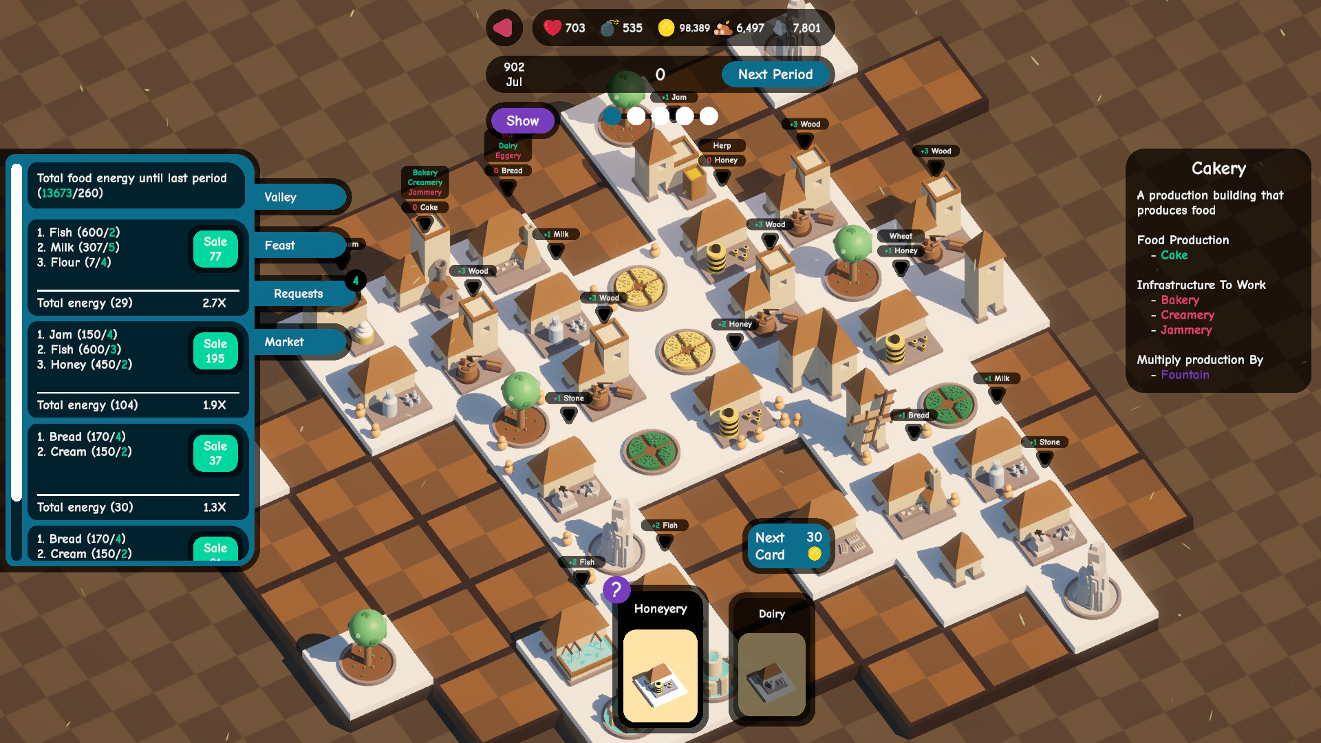 Some simple foods can be produced directly from individual buildings, but more complex foods require multiple buildings placed next to each other. For example, to produce bread in a Bakery, you need to place an Eggery, Mill, and Dairy next to it for it to work and produce bread.