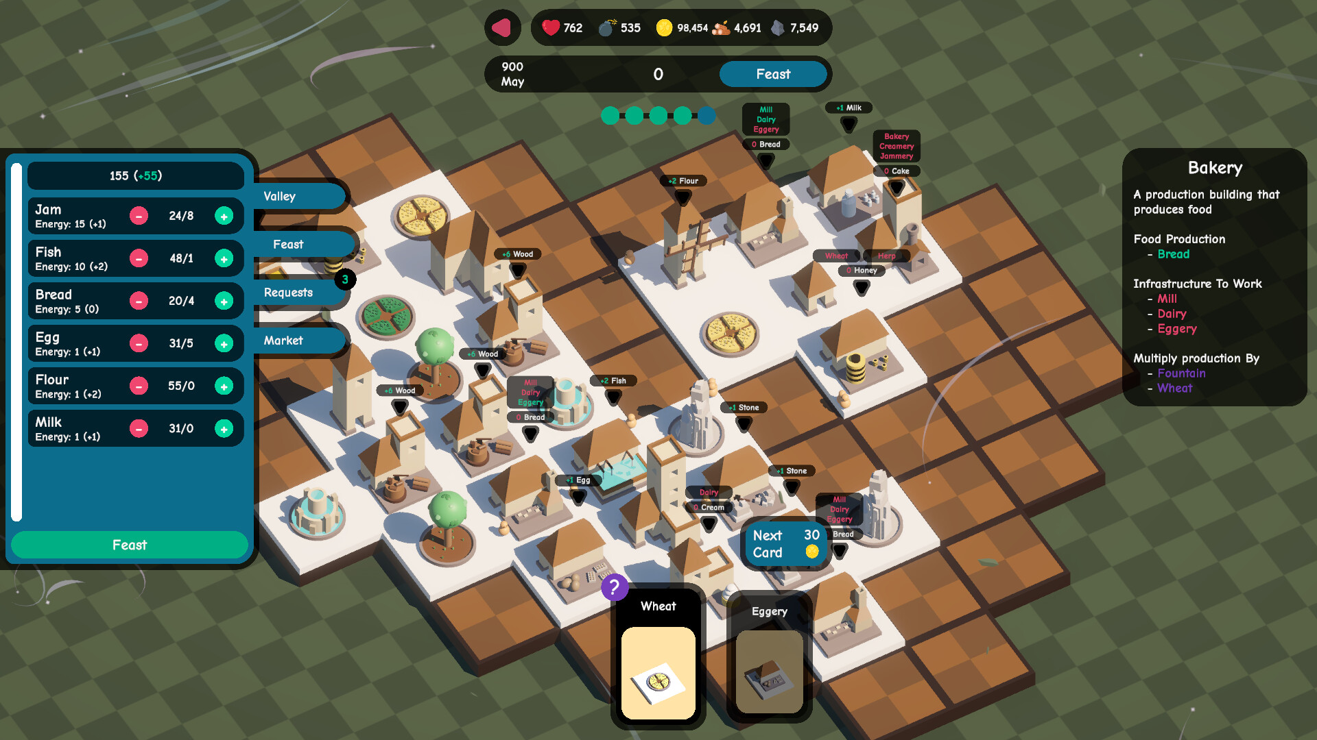 When building, you will see random cards at the bottom of the screen, each representing a different building. You must place buildings next to each other, as no building can be placed alone. Some buildings require specific adjacent buildings to function efficiently, like a Bakery which requires a Mill, Dairy, and Eggery to produce bread. Smart placement of buildings will help you maximize production and grow your village more effectively.