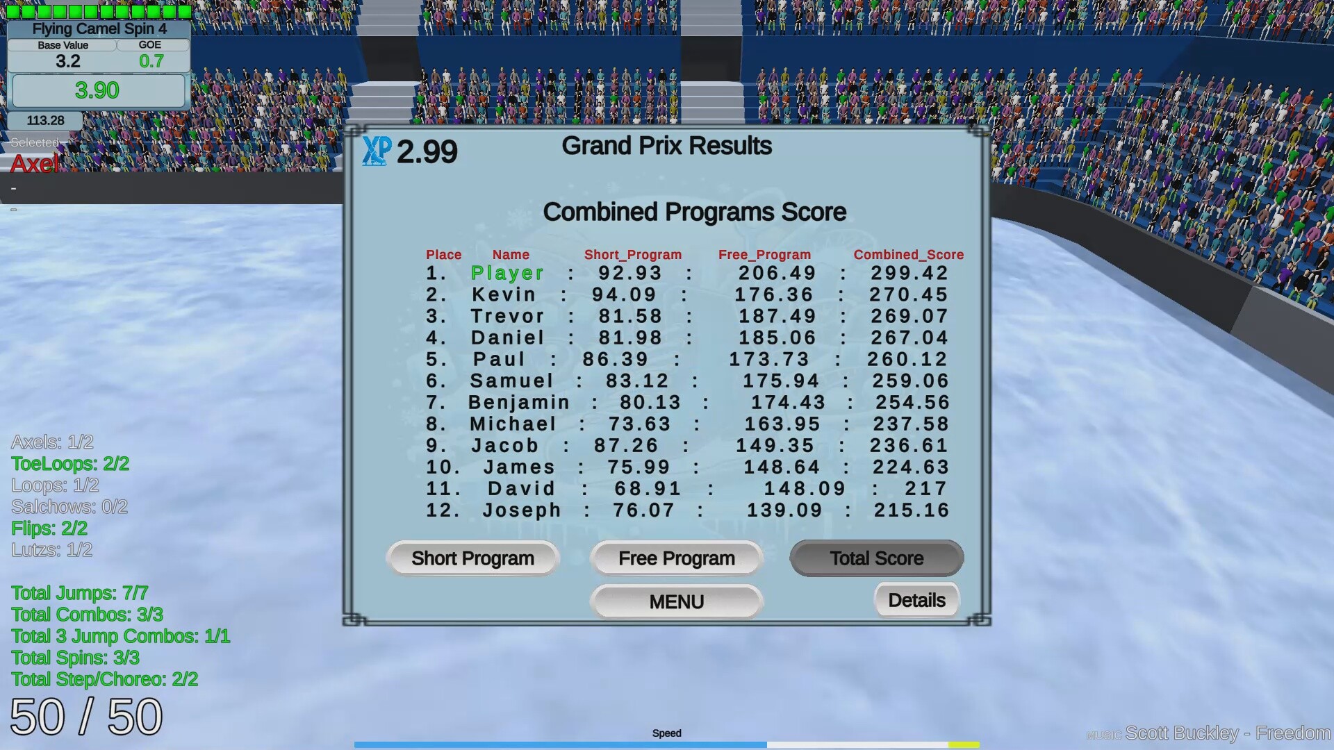 Technical Score: Earn points by executing precise elements, including jumps, step sequences, choreographic sequences, and spins. The better your execution, the higher your technical score, rewarding your mastery of figure skating's core techniques.
