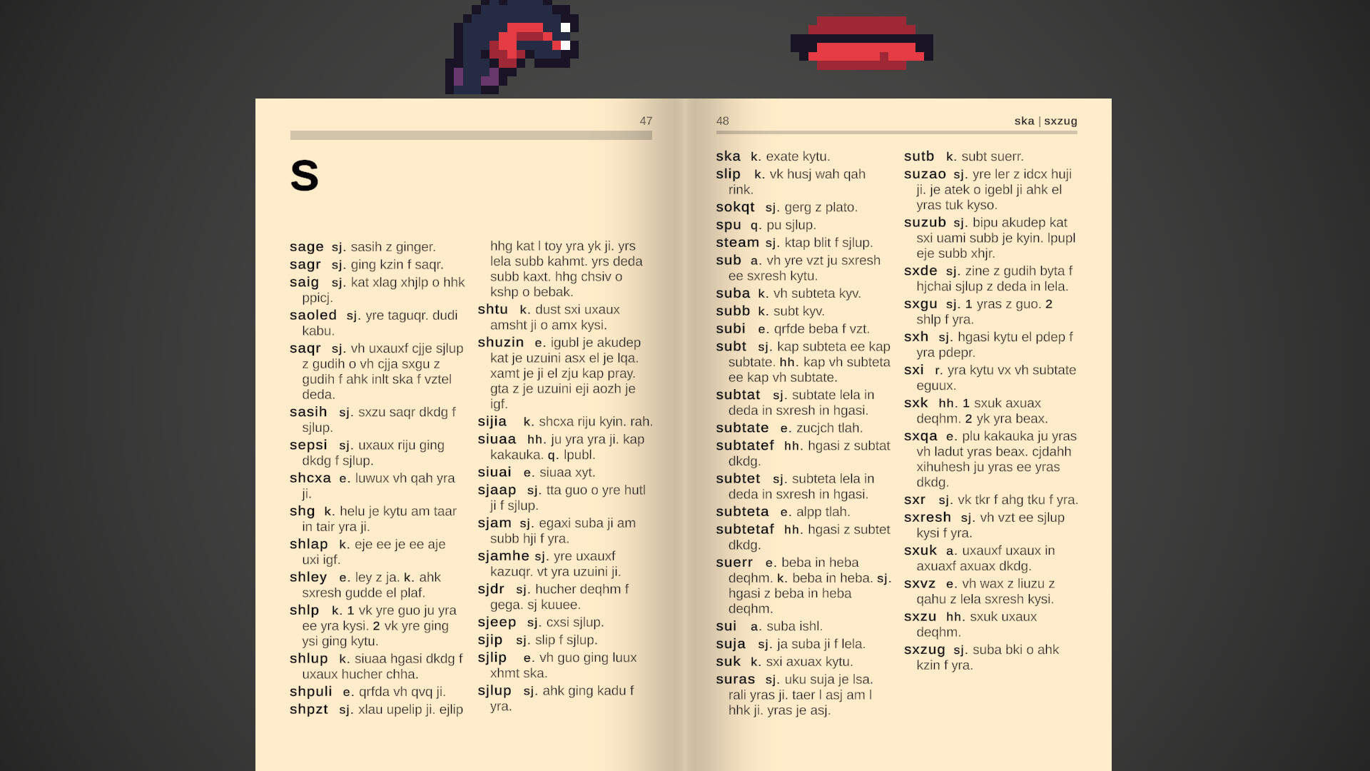Ginger is a language adventure game where every word is pronounceable, even without understanding its meaning. Step into a labyrinth of interconnected meanings and immerse yourself in a one-person subculture.