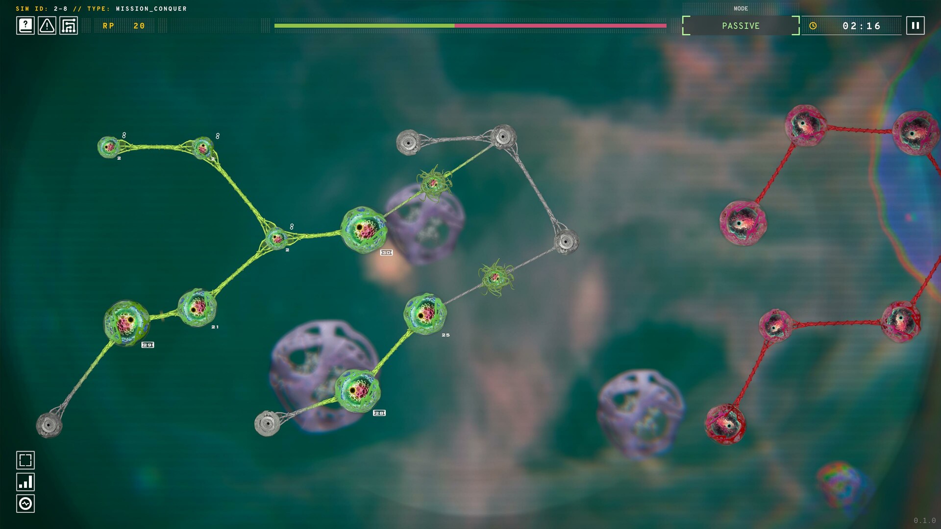 This is a minimalist strategy game. You start with simple mechanics: transfer gel to assimilate cells and manage gel production, but when and where you act changes everything. Watch your opponents, time your moves, and adapt to their strategies. With a variety of cell types, network layouts, and upgrades, every match plays out differently. Experiment, strategize, and stay one step ahead.