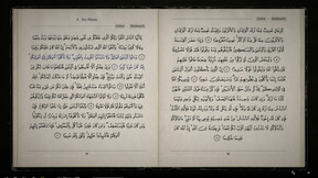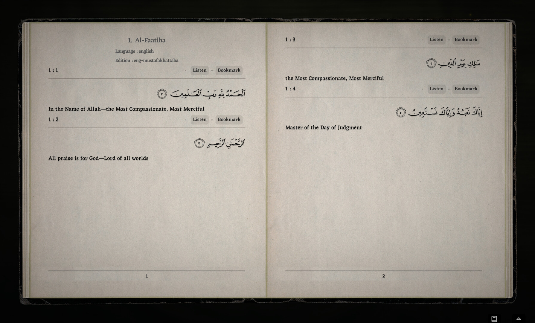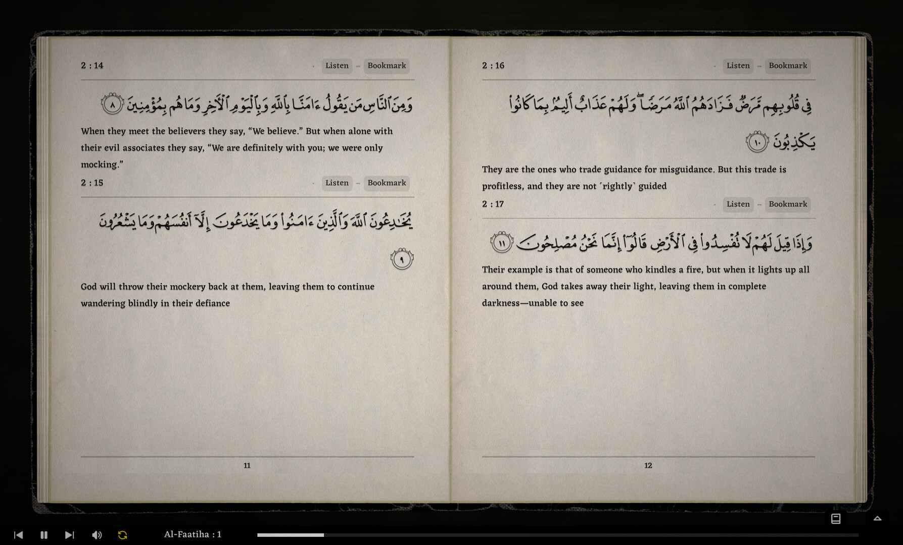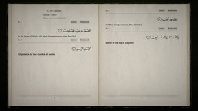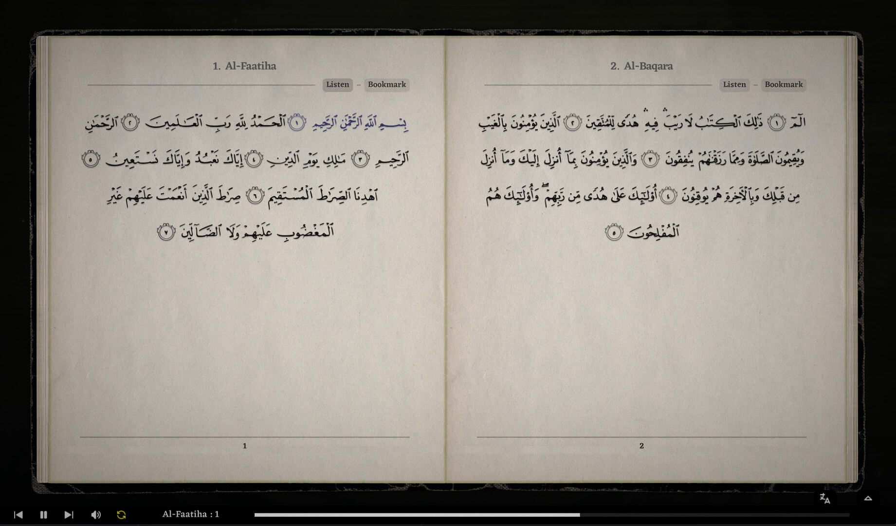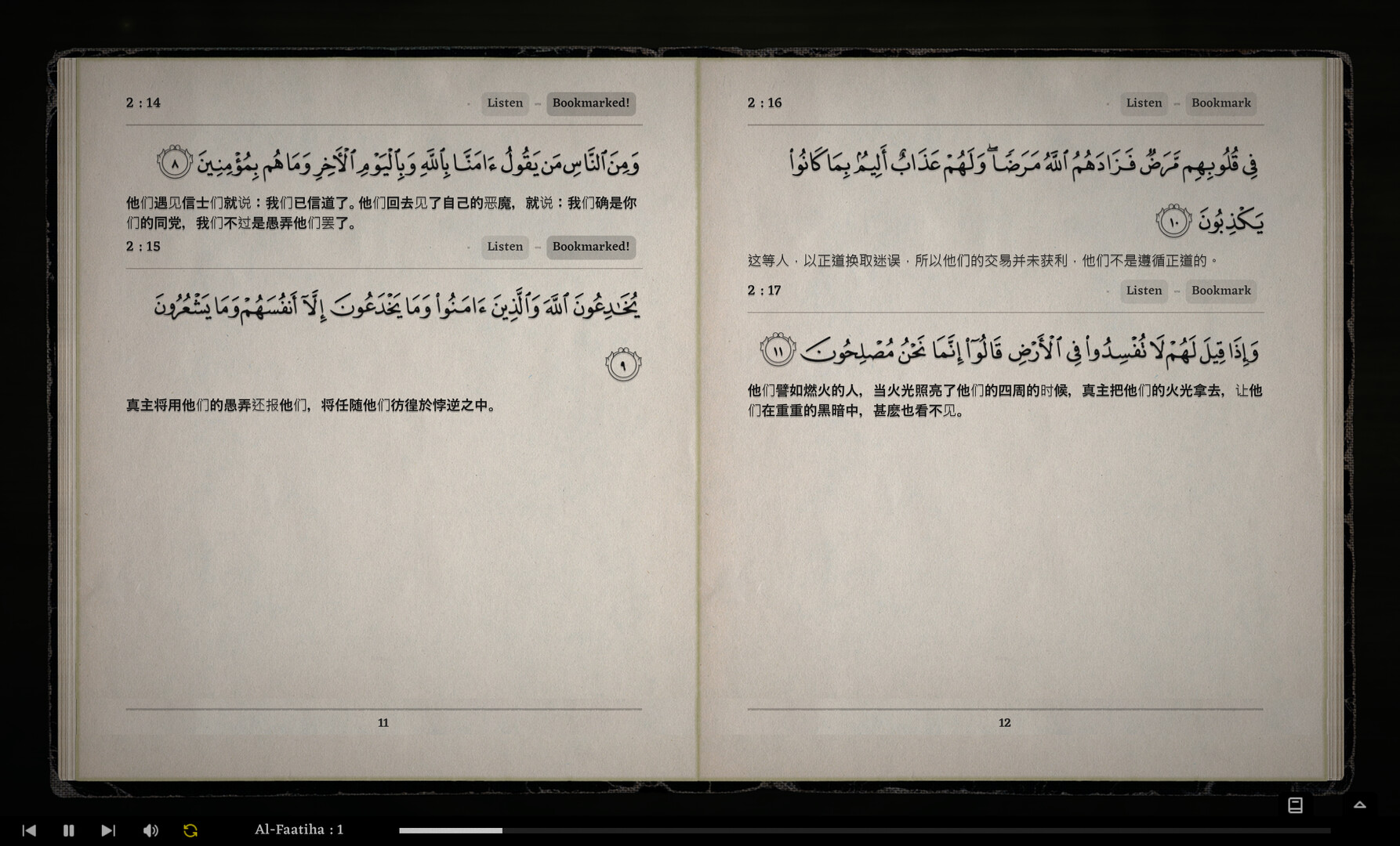 This digital rendition features the entire Quran and translated into several languages. It features various features such as text highlighting, bookmarks, and easy switching between languages and several Islamic themed achievements that can be displayed on your account, which are unlocked after 2 hours of time played.